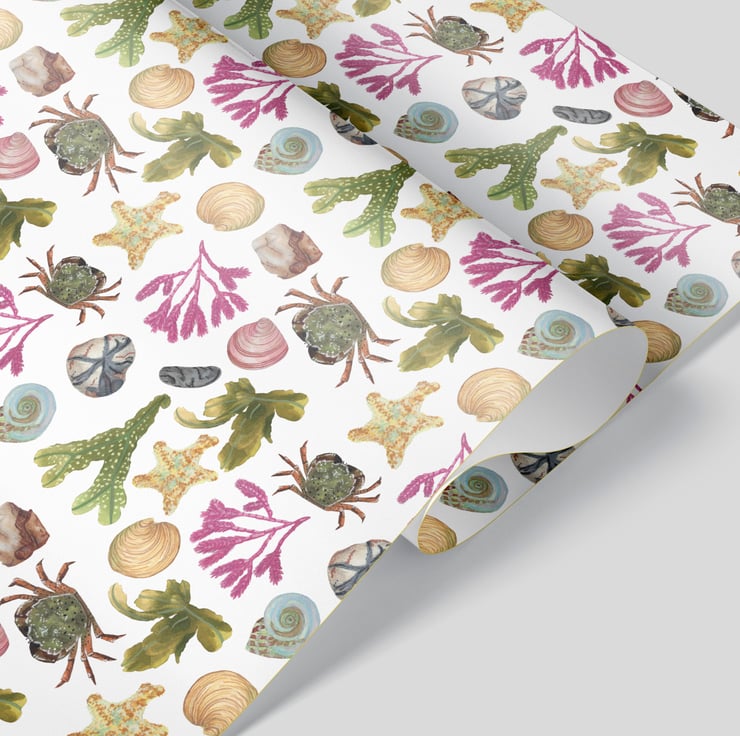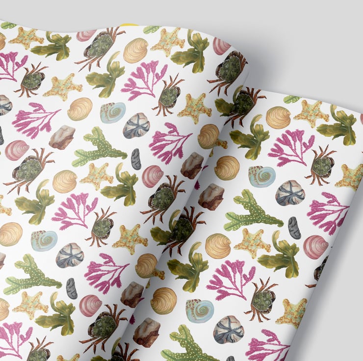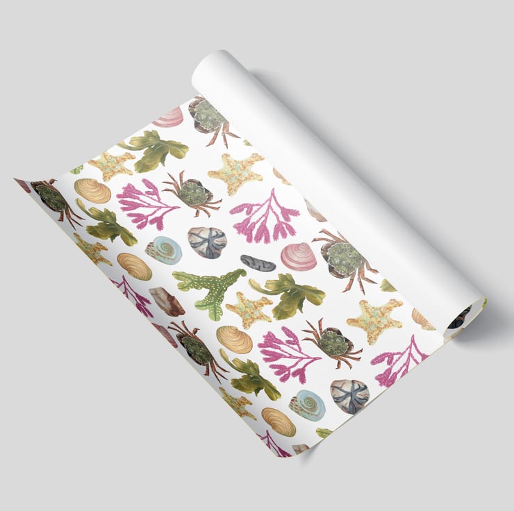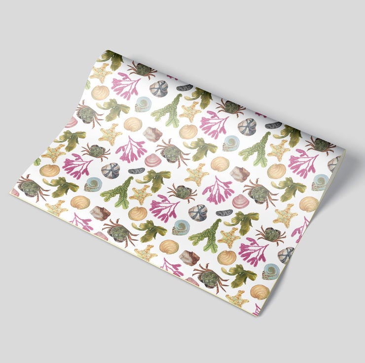 This Ocean life seaside rockpool wrapping paper is a great way to wrap up any gift for a special person or loved one. It has been printed on to 115 gsm silk paper giving a lovely shine and making it easy to wrap up any gift. This gift wrap is in sheets and measures 700mm x 500mm, each sheet comes withs two tags. Please note the gift wrap will be folded to fit into and A4 envelope.