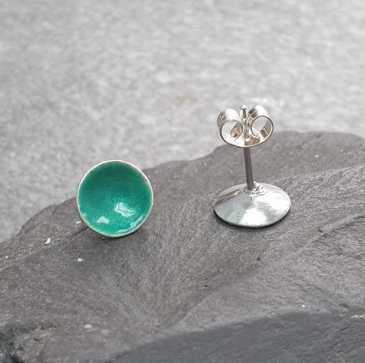 These sea green earrings are made from small discs of sterling silver, domed into little cups and filled with glossy green vitreous enamel, which is torch fired by hand.. The backs of the earrings are polished to a shine. The ear posts and butterfly backs are also sterling silver.