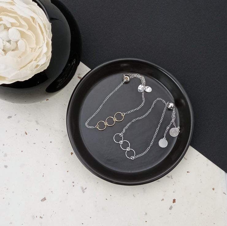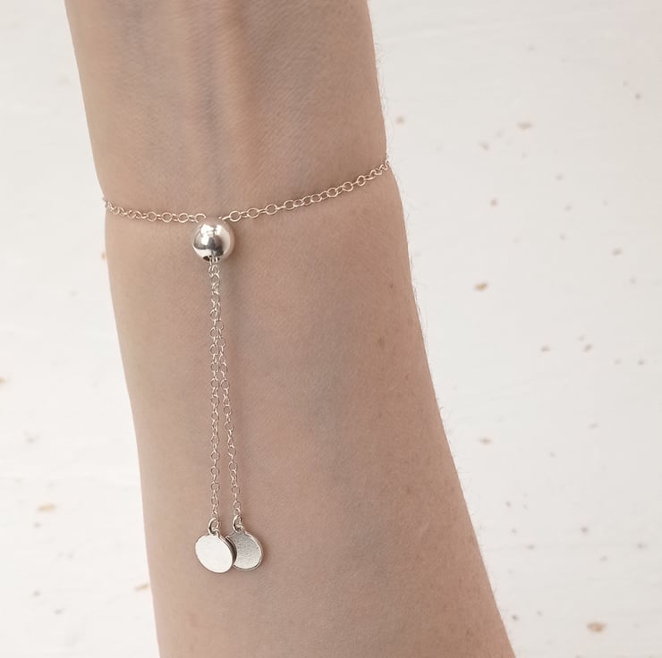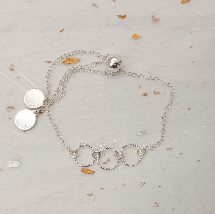 I have created this bracelet by attaching sterling silver rings to chain, with tags on the ends (all in sterling silver). The chain is held together with a sterling silver sliding bead, which enables the wearer to adjust the length of the bracelet. This piece is part of a collection of minimalist bracelets.