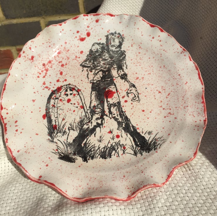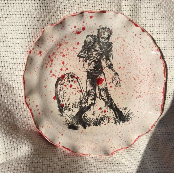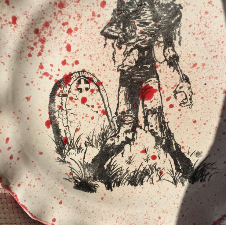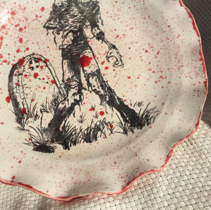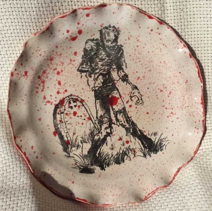 Plate/platter featuring a Zombie in a graveyard. White stoneware plate with a screen printed Zombie and splattered with red glaze. Plate is 9 inches in diameter. and has a fluted rim! Handmade from a slab of clay.