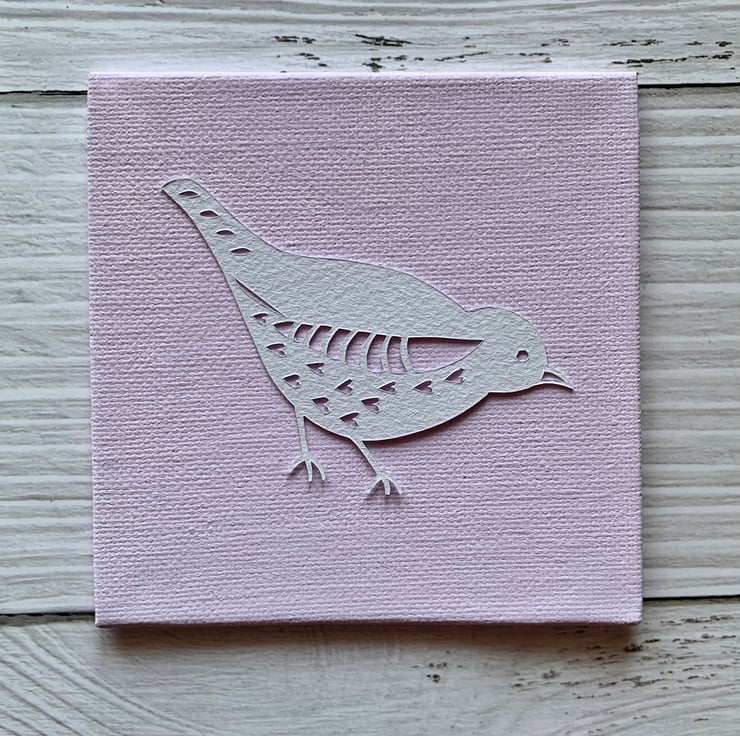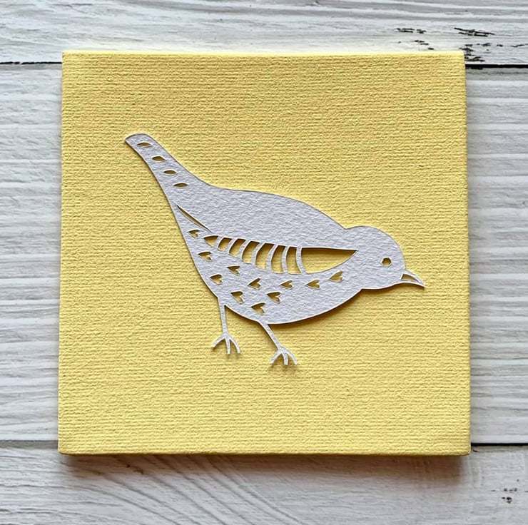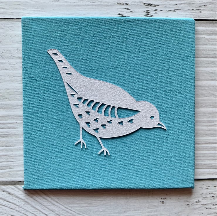 Cut on soft white murano 160gsm paper and mounted onto your choice of painted or linen canvas board.