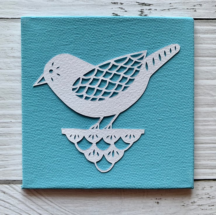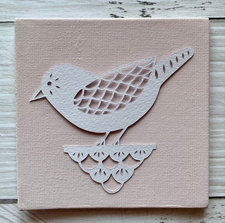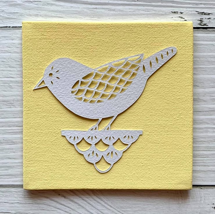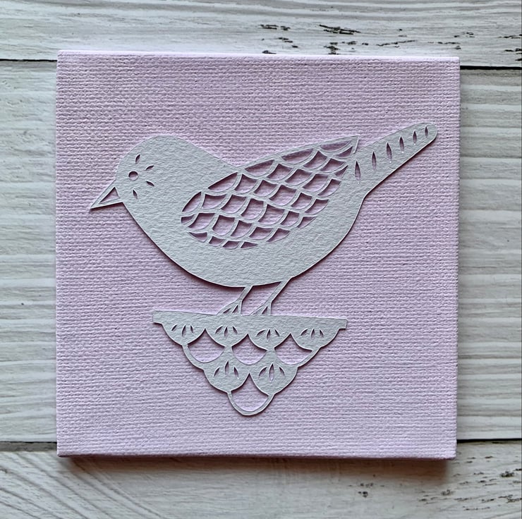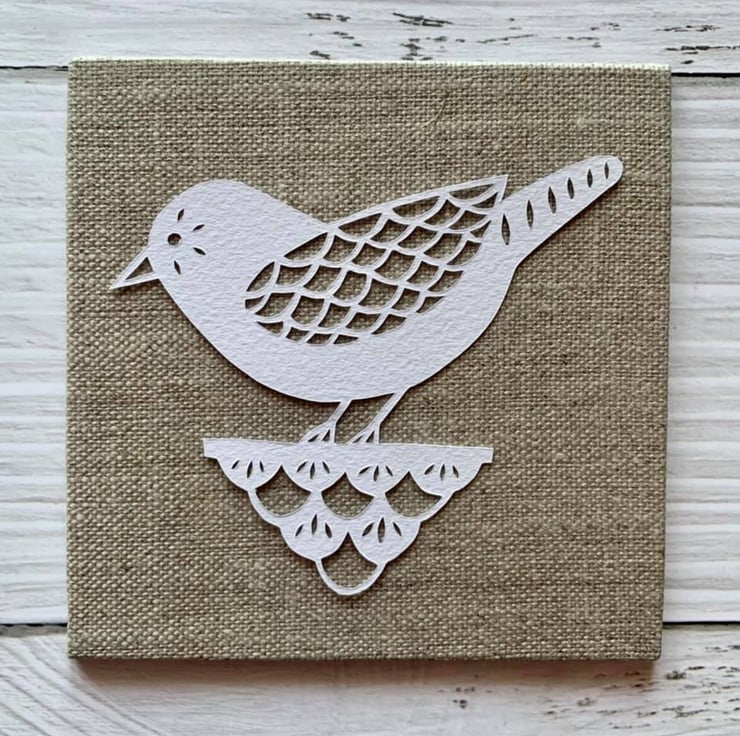 Cut on soft white murano 160gsm paper and mounted onto your choice of painted or linen canvas board.