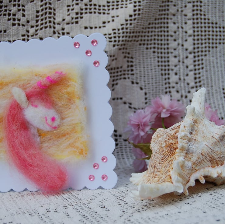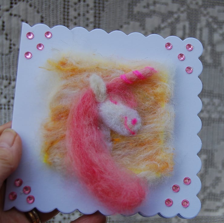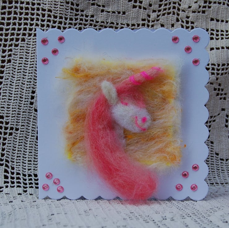 A Unicorn needle felted onto a piece of commercial felt and lightly attached to a card.