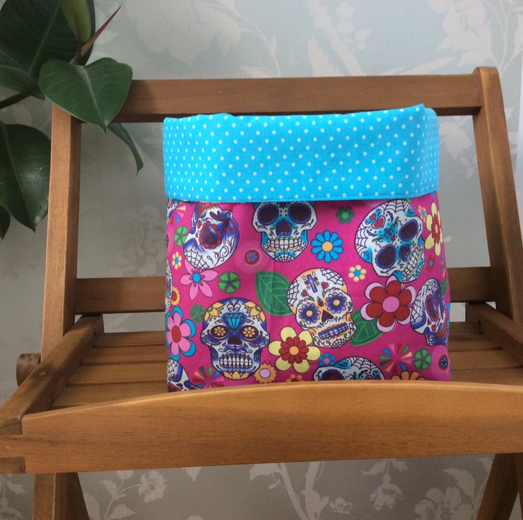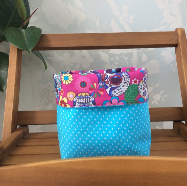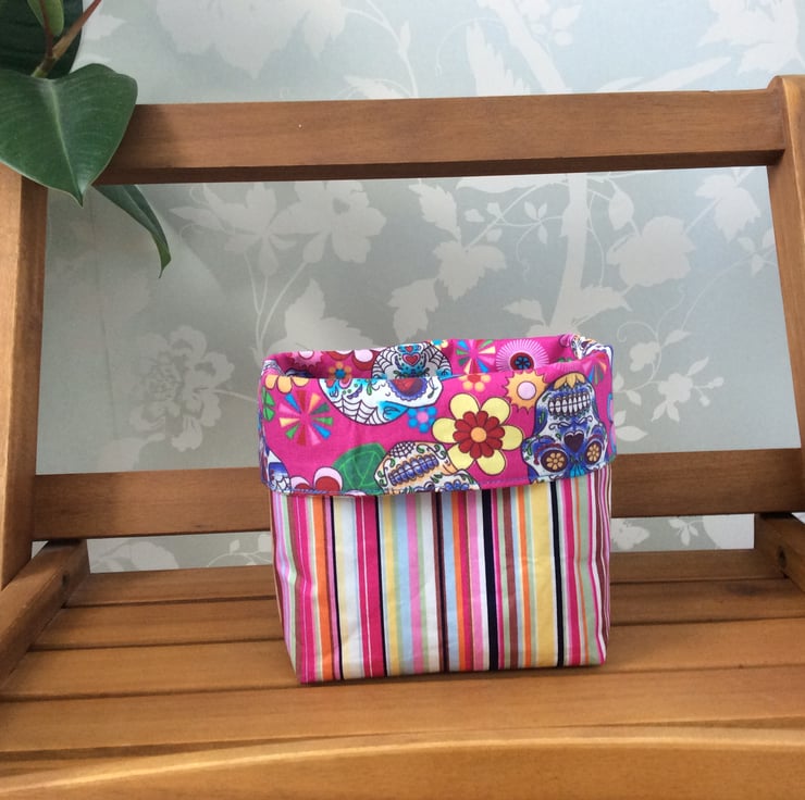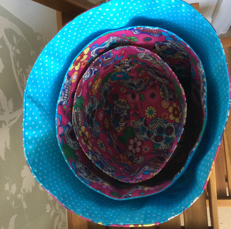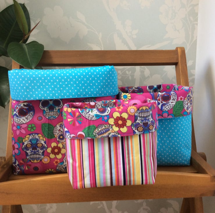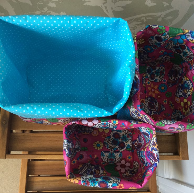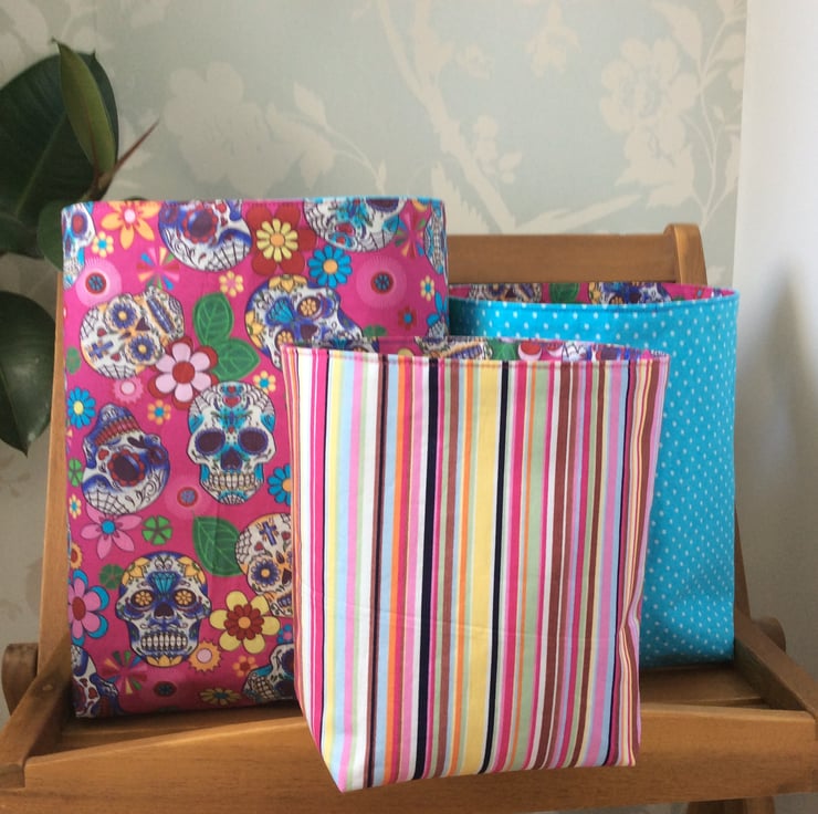 They are made from a cute Floral cerise Skull cotton poplin, Blue spotty cotton and Candy stripe cotton poplin fabrics.