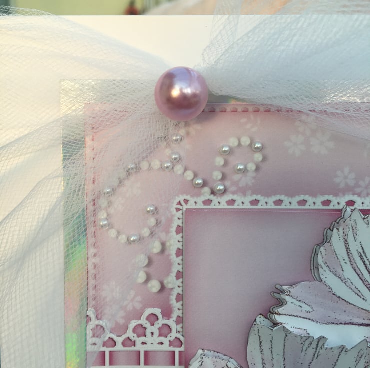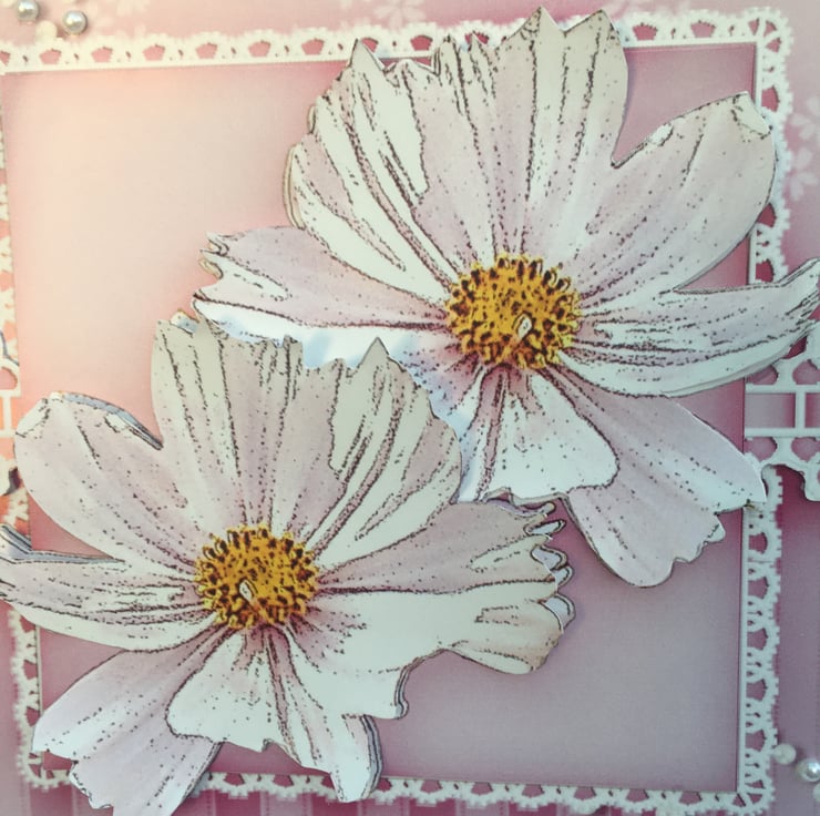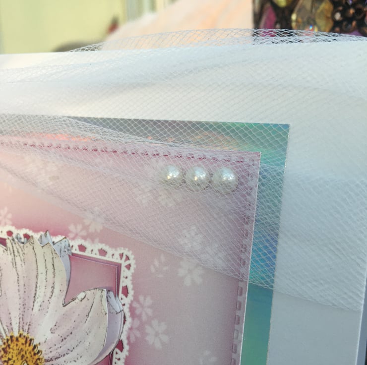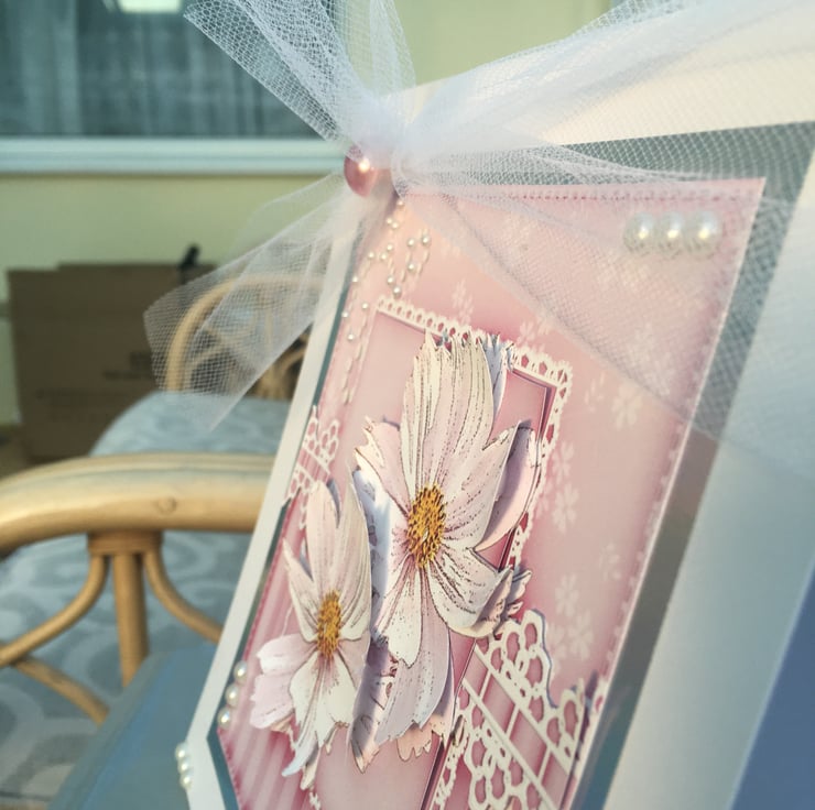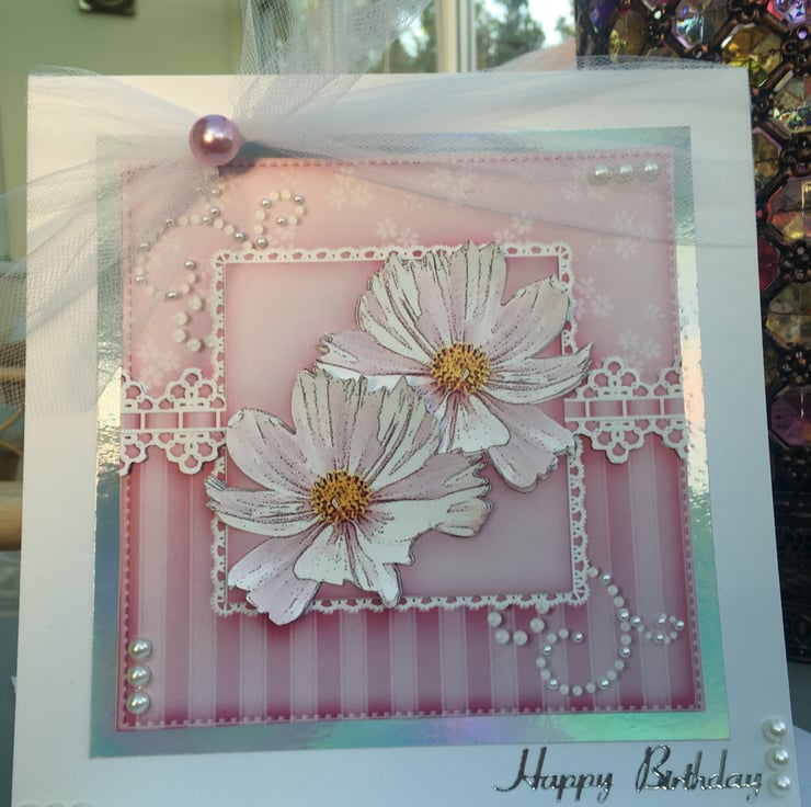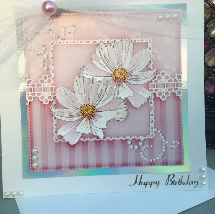 A pretty and feminine birthday card fit for a special person. This 20x20cm square card is in soft pinks and white. The main image is of two pink and white daisy flowers decoupaged and shaped to raise them off the page. There is lace detail and pearls to finish off the design. White tulle is tied across the top and is finished off with a large matching pink pearl. The greeting is Happy Birthday. Inside the card has an insert which says wishing you a happy birthday.