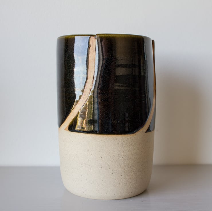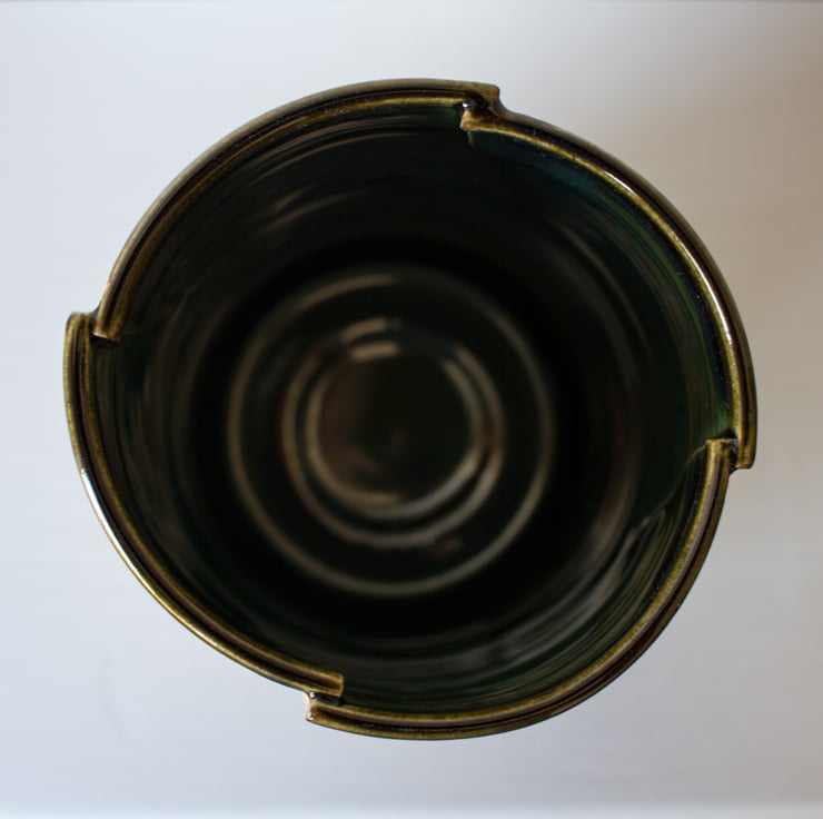 The inside has been glazed in a green colour and will hold water if you wanted to put fresh cut flowers in it. The outside has been glazed in a dark green; The pleats or lines were created while the clay was leather hard. Lines of equal length were cut into the clay and then overlapped and gently re-joined creating crisp pleats. Wax resist was used to prevent the glaze from covering the area next to each pleat highlighting it as a curve.