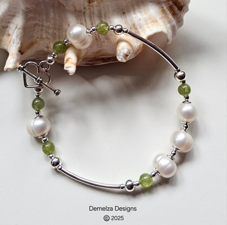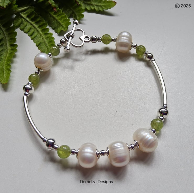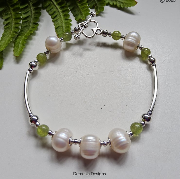 An eye catching 'one off' genuine gemstone bracelet designed and hand crafted in Cornwall using large 12mm baroque Freshwater pearls and 4mm quality peridot rounds. All outer components are quality anti tarnish silver plate. For the main construction professional stainless steel jewellers wire has been used for added strength and lasting durability finishes off with a heart design tibetan silver toggle clasp.