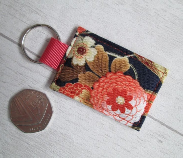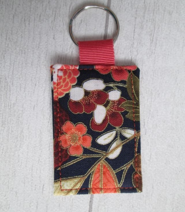 There was just enough of this gorgeous Japanese floral print left for this keyring/bag tag - beautiful flowers in autumnal shades picked out in metallic gold. Stiffened with interfacing. it measures 6 cm x 4 cm and is fitted with a metal split ring for keys or attaching to a bag or suitcase.