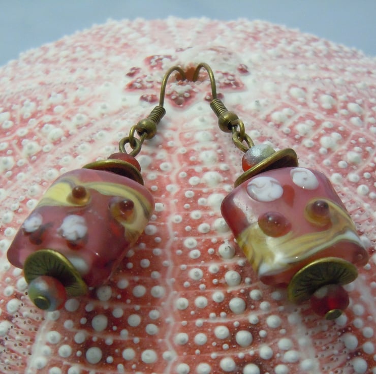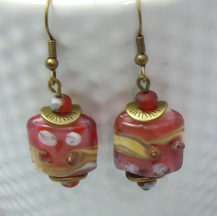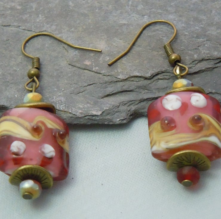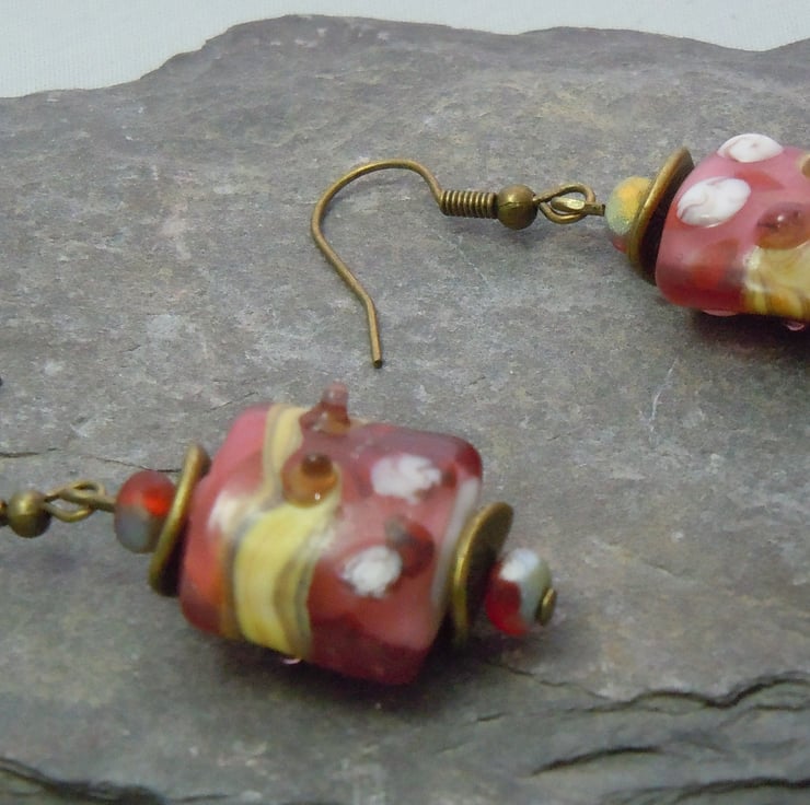 Drop earrings with gorgeous artisan Lampwork cushion beads in pink & yellow & Czech glass frosted red, grey & yellow rondelle beads with wavy antique bronze bead caps & antique bronze ear wires. There is a similar necklace. Lovely warm summery colours for a boho loved one.
