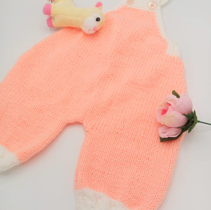Beautiful baby's dungarees hand knitted in peach and white aran weight yarn. They have a practical bib and brace front and cabled cuffs, which reach to just below the baby's knees.