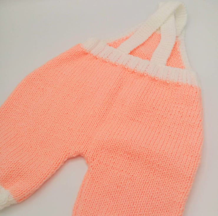 Beautiful baby's dungarees hand knitted in peach and white aran weight yarn. They have a practical bib and brace front and cabled cuffs, which reach to just below the baby's knees.