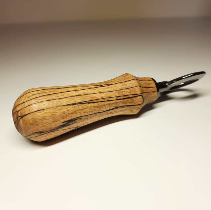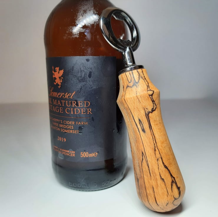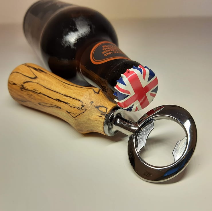 Handmade in Surrey in April 2021. This bottle opener is sanded to 400 grit then given multiple coats of "Hampshire Sheen" food safe danish oil, which not only protects the wood but enhances the natural grain and colour of the spalted beech. A coating of beeswax/mineral oil also gives the handle a glossy sheen.