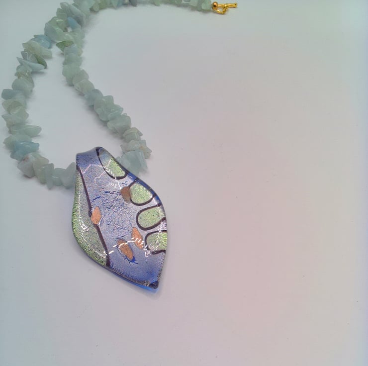 Green Jade Chip Necklace with a Blue Green & Gold Glass Pendant, Blue Glass Necklace, Blue and Green Pendant, Birthday Gift, Anniversary Gift, Mother's Day Gift, Gift for Her, Glass Pendant, Jade Chip Necklace