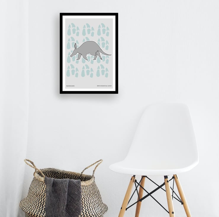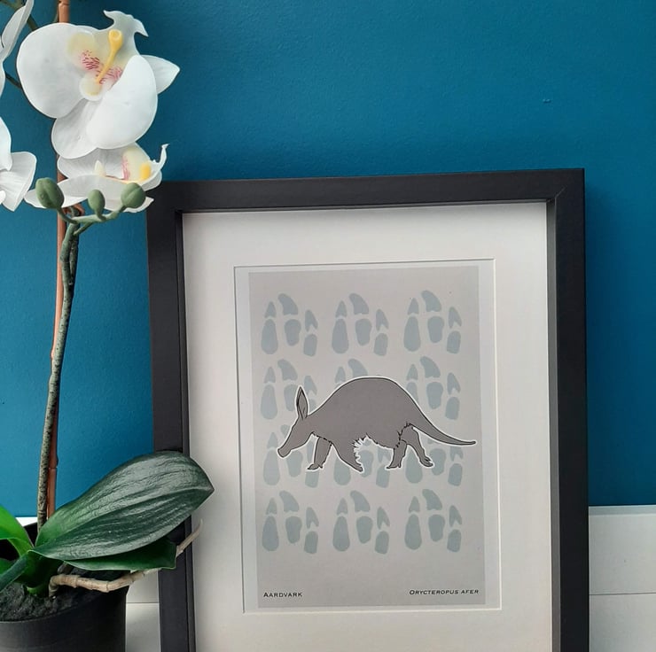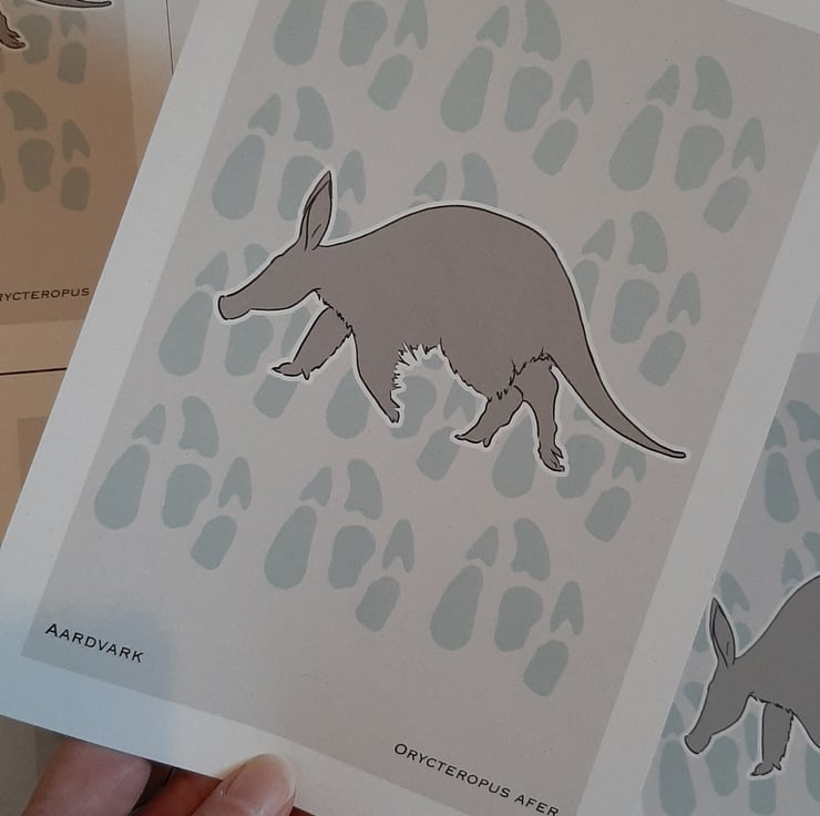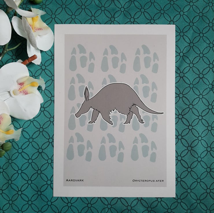 Line drawn, dark grey silhouette of an Aardvark, with a coloured paw prints and light grey background. Species name and scientific name located at the bottom of the print.
