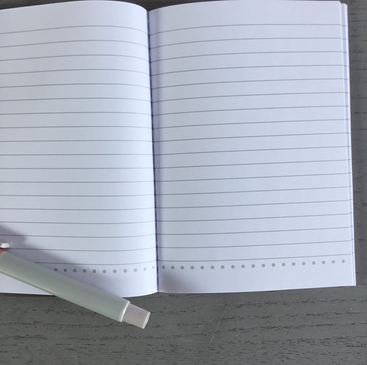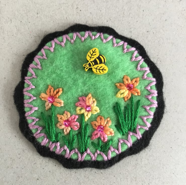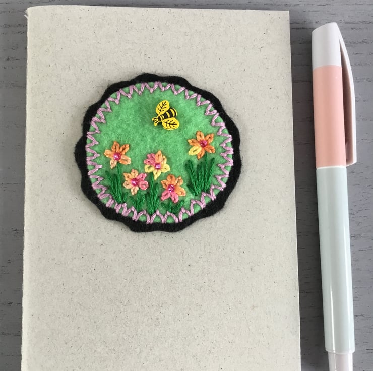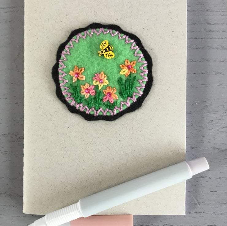 This lined notebook has a lovely garden scene of a bee buzzing around a border of flowers. The circular felt picture is hand embroidered on circles of pale green and black felt. A little bee button is sewn above a border of pink, orange and yellow flowers. These flowers have hand embroidered Lazy-Daisy Stitches for petals, a seed bead for the stamen, Long and Short Stitches for the stems and leaves.