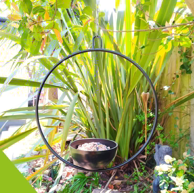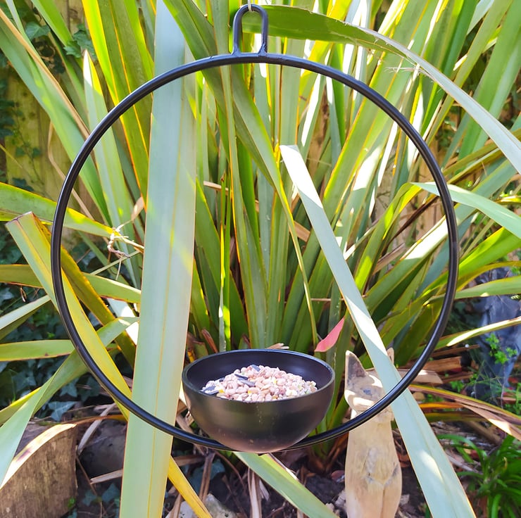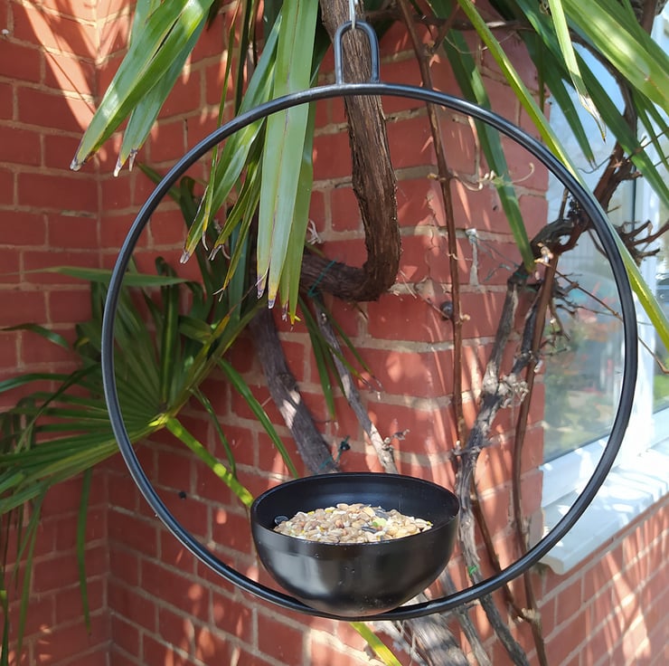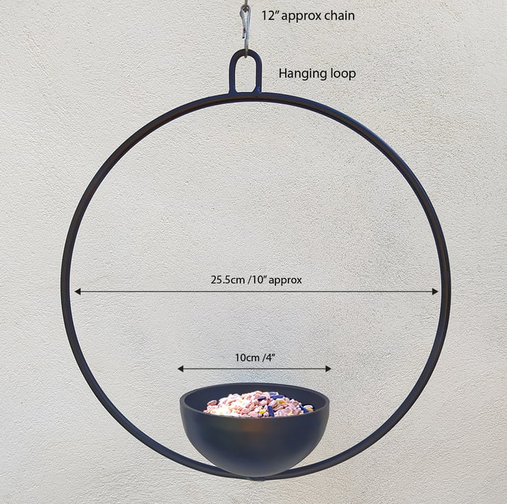Hang anywhere hand made bird feeding bowl in black. Hang from pergola, hanging basket bracket, a tree branch etc... Made from mild steel finished in black. Bird feeder bowl Includes drainage hole. Hanging frame 25.5cm (10") diameter, 10cm (4") bowl. Includes hanging loop and attachable chain.
