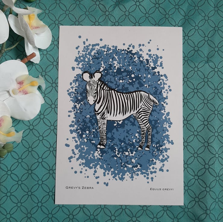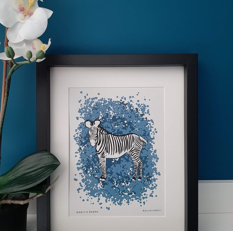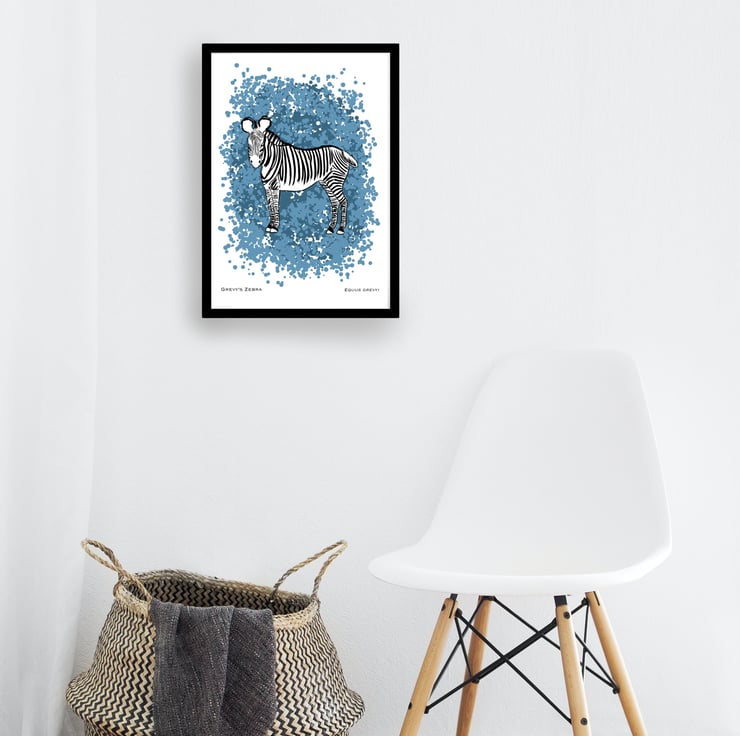 Line drawn, white silhouette of a Grevy's Zebra, on a brightly coloured blue dotty background. Species name and scientific name located at the bottom of the print.