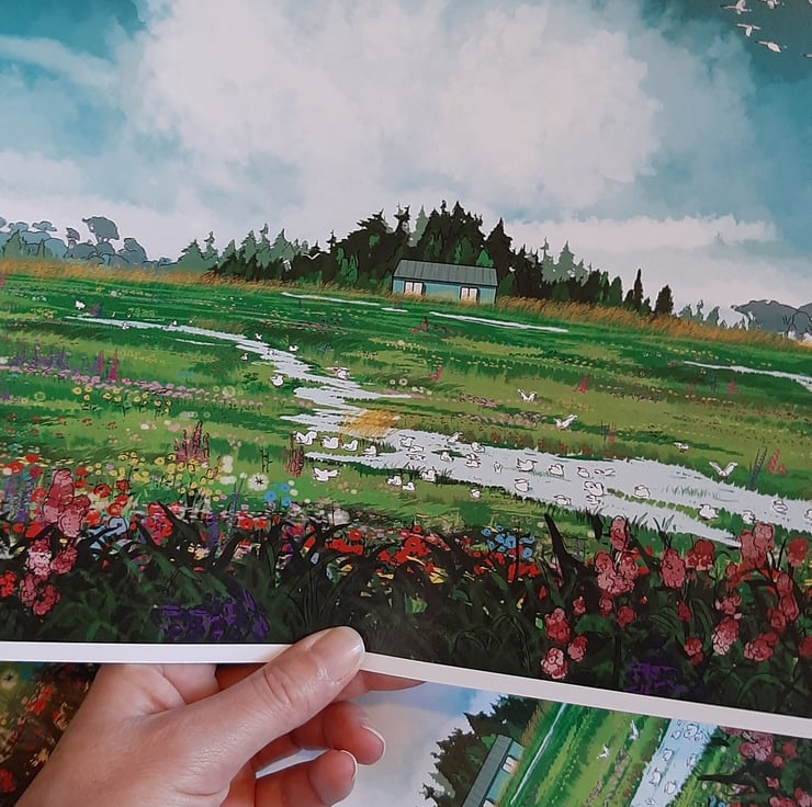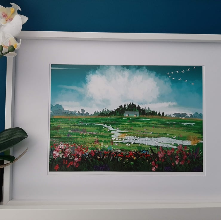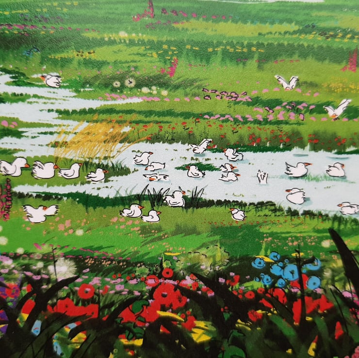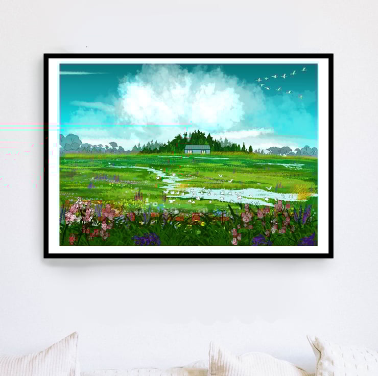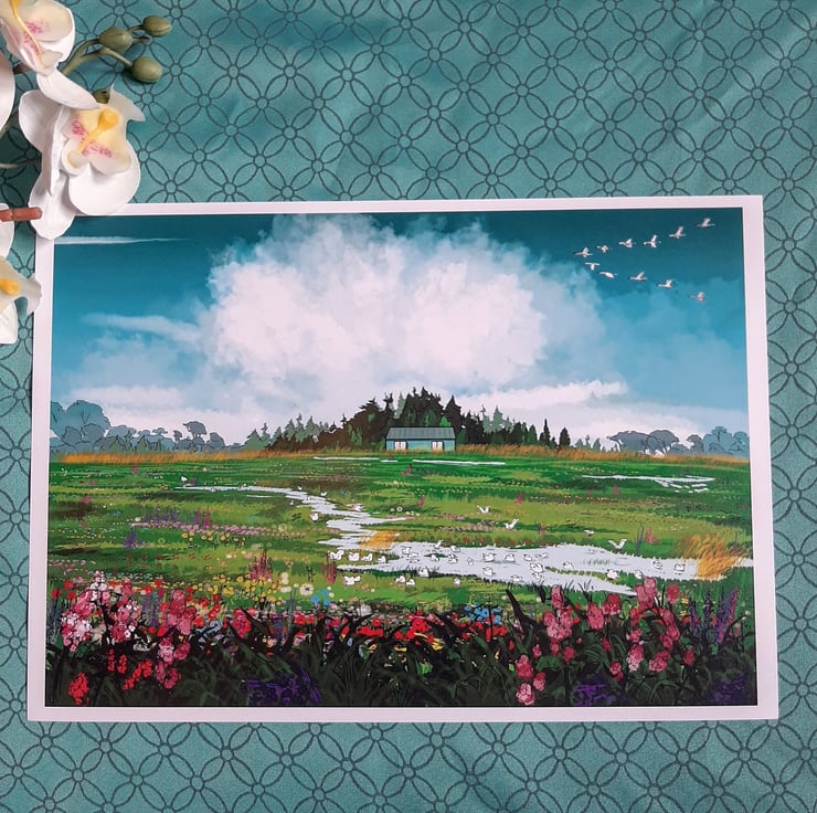 A brightly coloured, blue and green landscape of a field full of flowers and birds. This field is an agriculture field in reality, nestled away in Fens of East Anglia - imagine what it would be like if left wild! When flooded, seagulls arrive to make the most of the water, after a long day feasting on the insects ploughed up nearby.