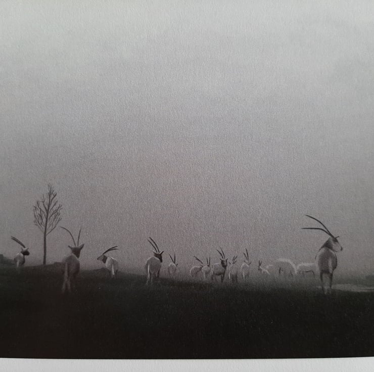 A atmospheric scene of a foggy morning, with a herd of Scimitar-Horned Oryx grazing in their paddock, sunlight trying to break through the clouds.