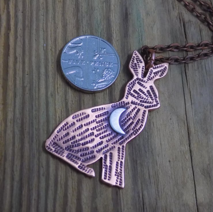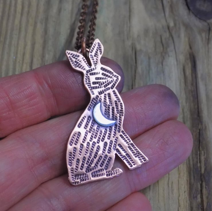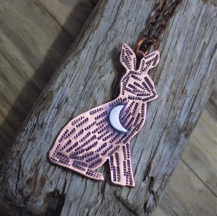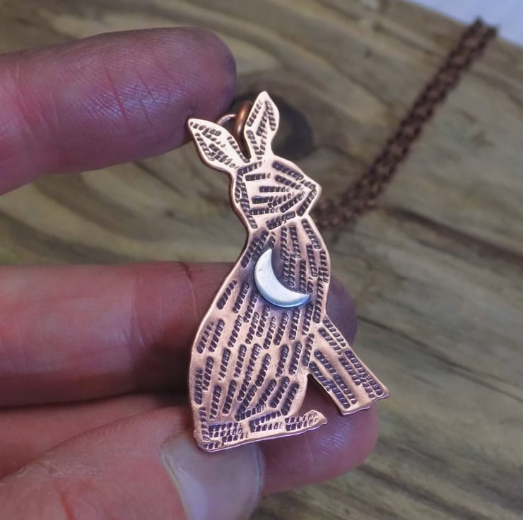 Designed and hand sawn from 1.2 mm thick copper sheet. Each textured stroke has been stamped onto the copper to create the hares coat and a sterling silver crescent moon has been soldered to the front. The pendant has been given an aged effect which picks out all the detail and texture creating a lovely contrast between the silver and copper. Suspended from a 19-21" adjustable antique copper tone chain (lead and nickel free)