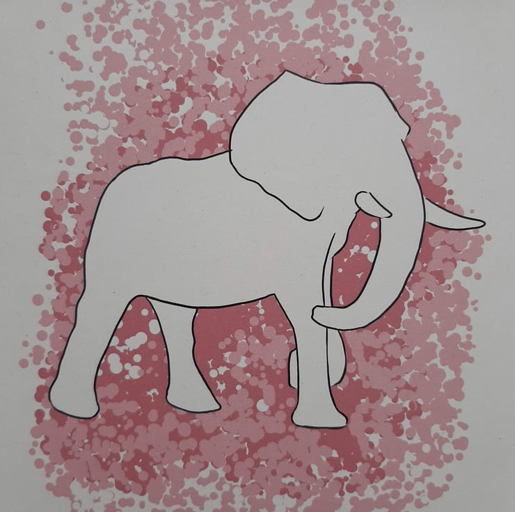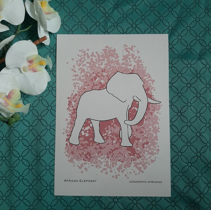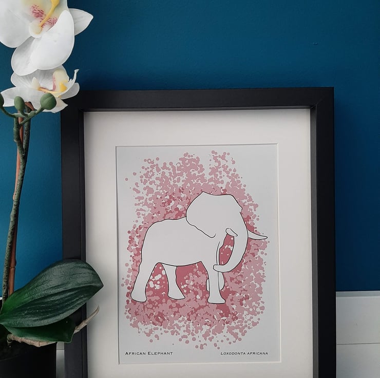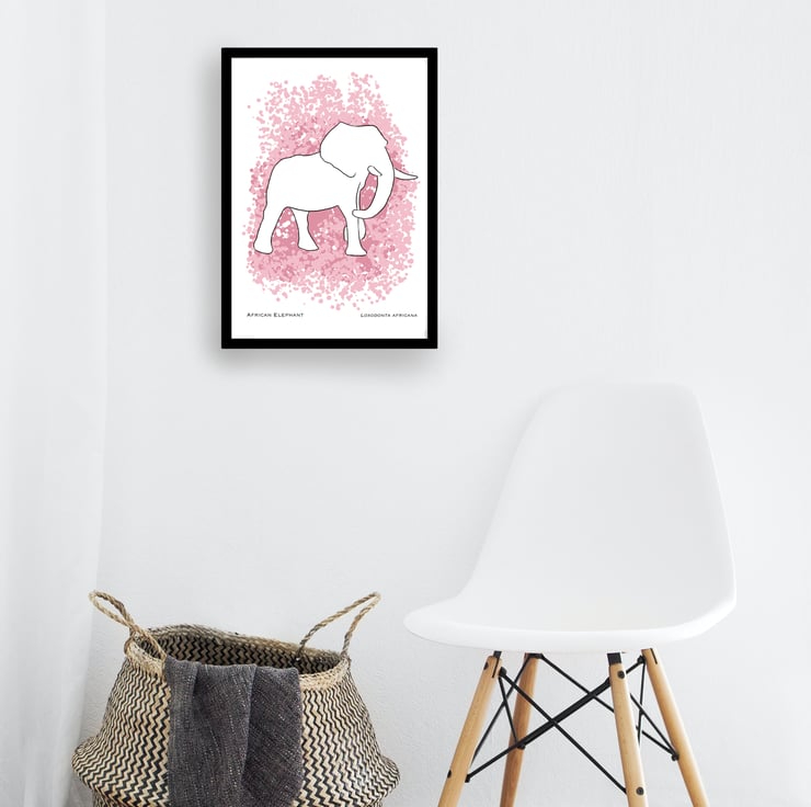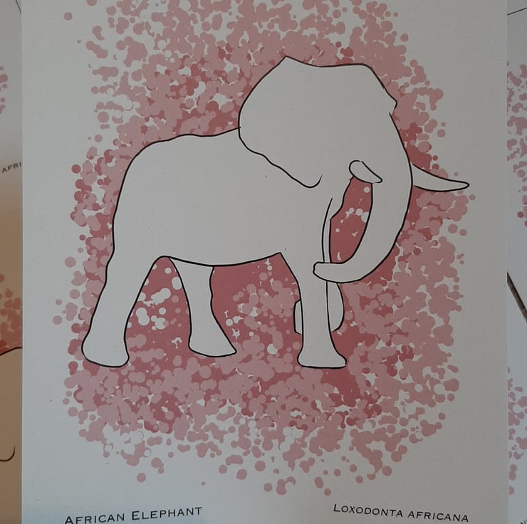Line drawn, white silhouette of an African elephant on a brightly coloured pink dotty background. Species name and scientific name located at the bottom of the print.