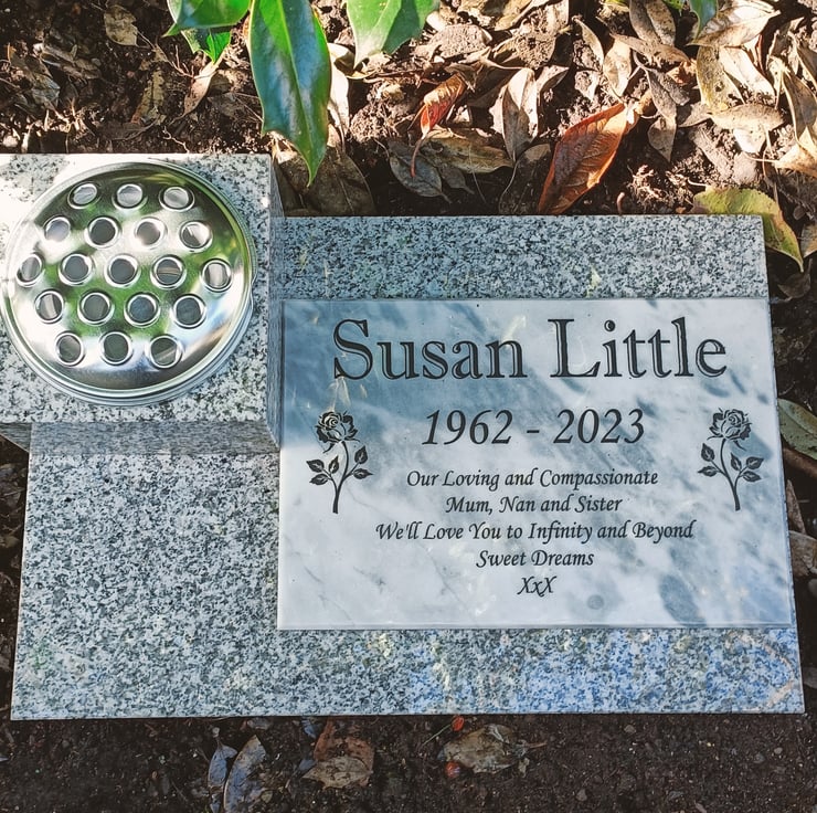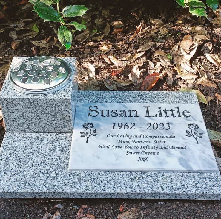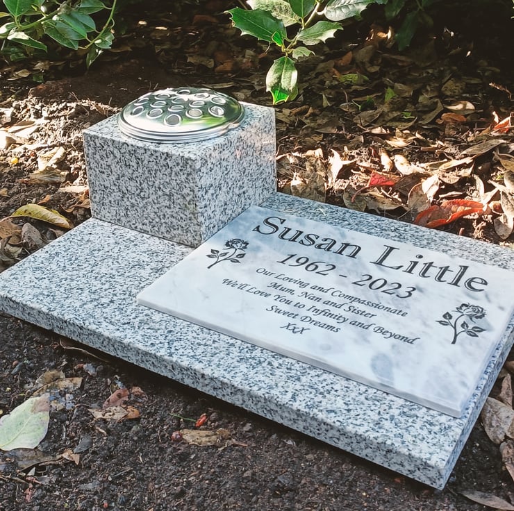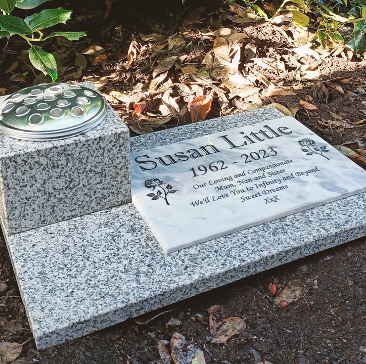 Precisely Laser Etched Directly into the grey/White Marble using our state of the art technology, for a fully weatherproof and high quality finish.