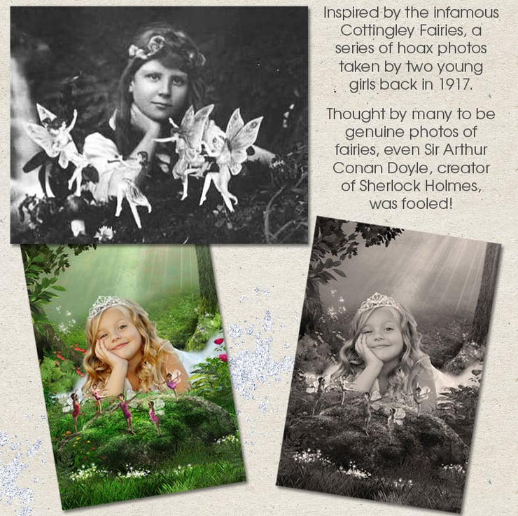 I offer a free checking service before you order, so you know your photo will work with the Portrait before you pay. Send your photo, telling me you'd like the Cottingley design, to queries@photofairytales.co.uk (Visit https://www.photofairytales.co.uk/bestphoto.html for tips on choosing the best photo)