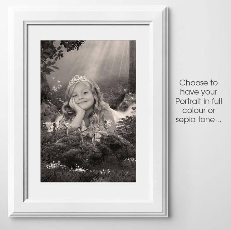 The magical world of fairy tales – capture your child’s imagination, placing them into their own enchanted setting! Working from your own photo, I’ll create a bespoke fantasy portrait: custom designed, carefully building layer upon layer of digital art so that your final image is truly unique. I create each Portrait individually, ensuring the composition is carefully, sympathetically adjusted to suit your photo and the design. Your finished Portrait may be slightly different to the example shown here – each completed image is unique.