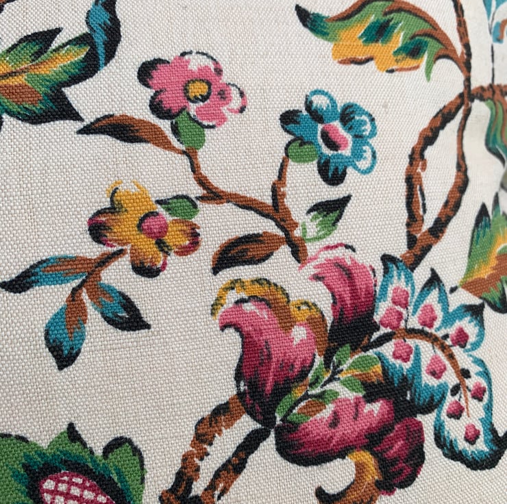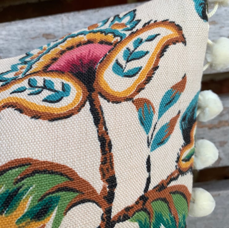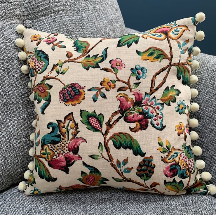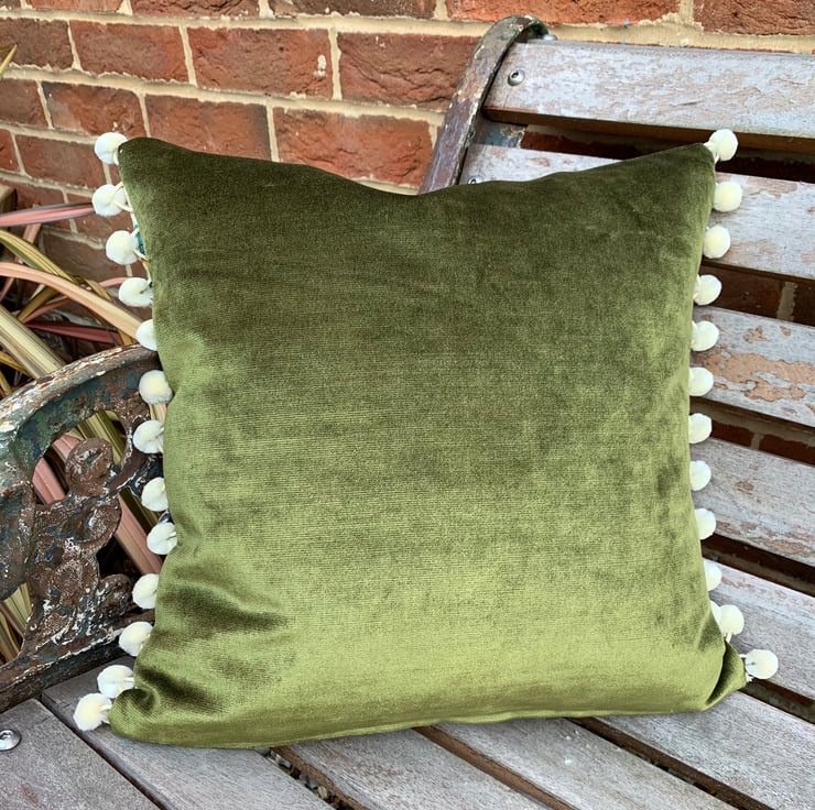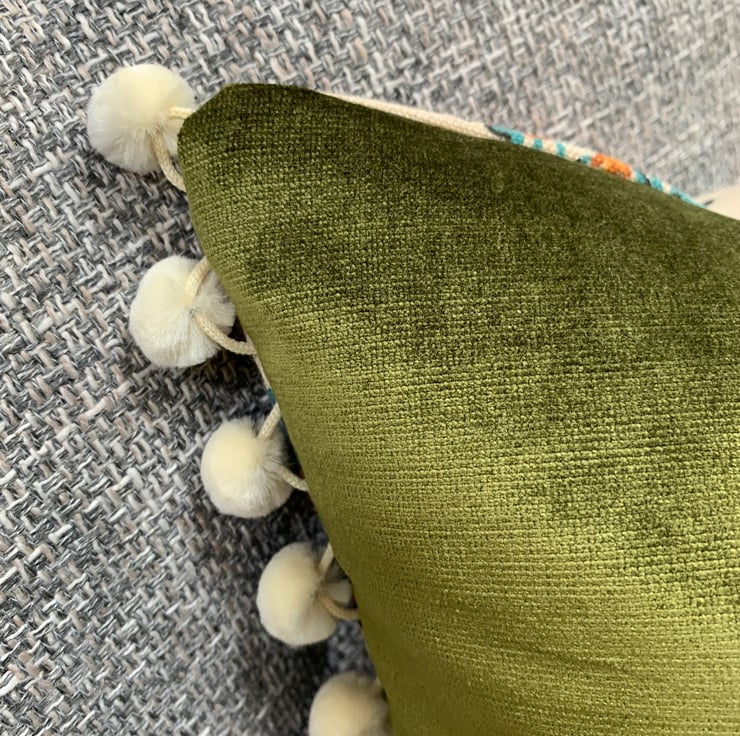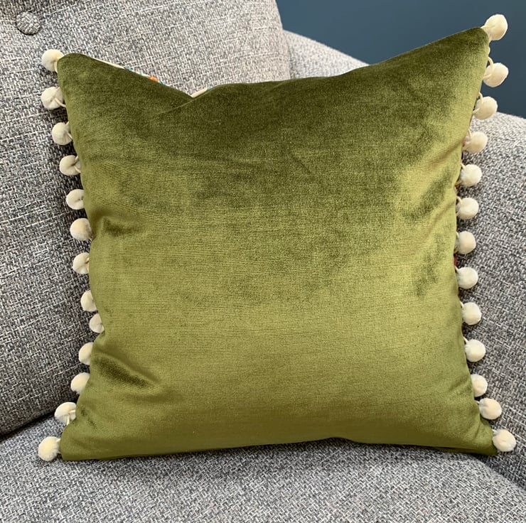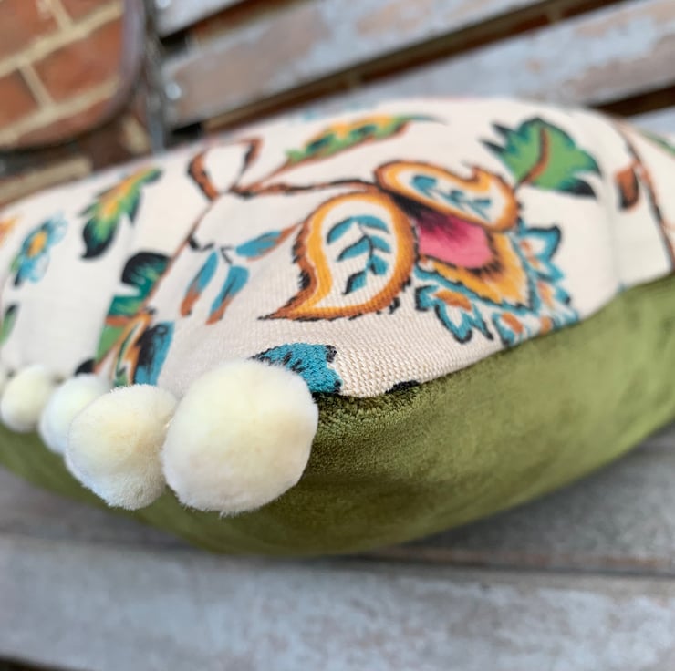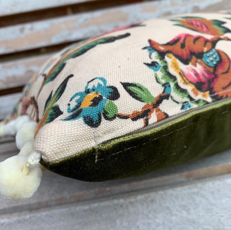 One of a kind cushion cover with pretty vintage print front and luxurious olive green designers guild velvet back, trimmed with velvety cream pompoms.