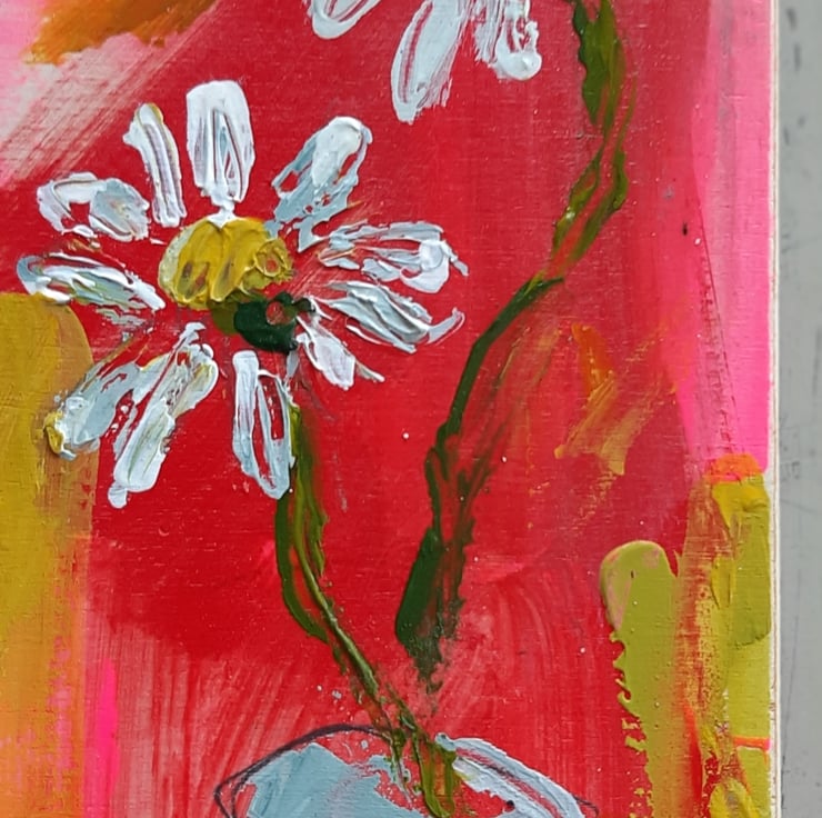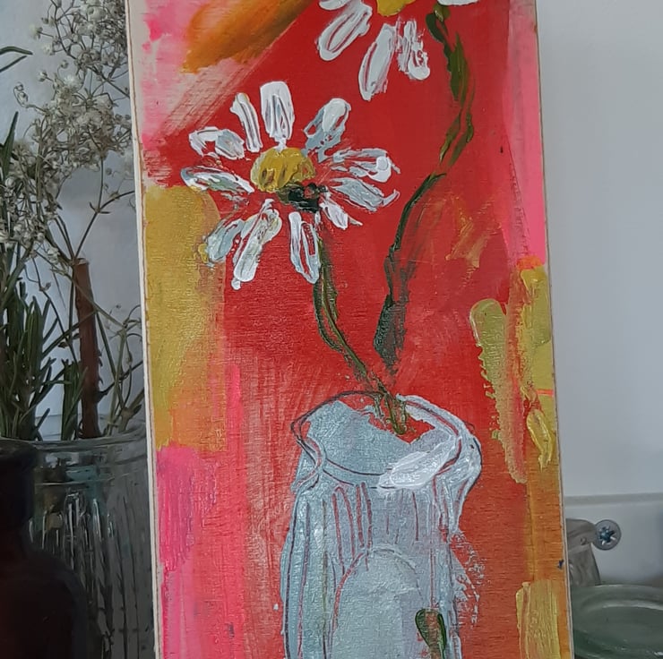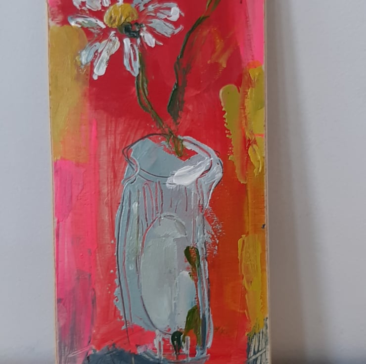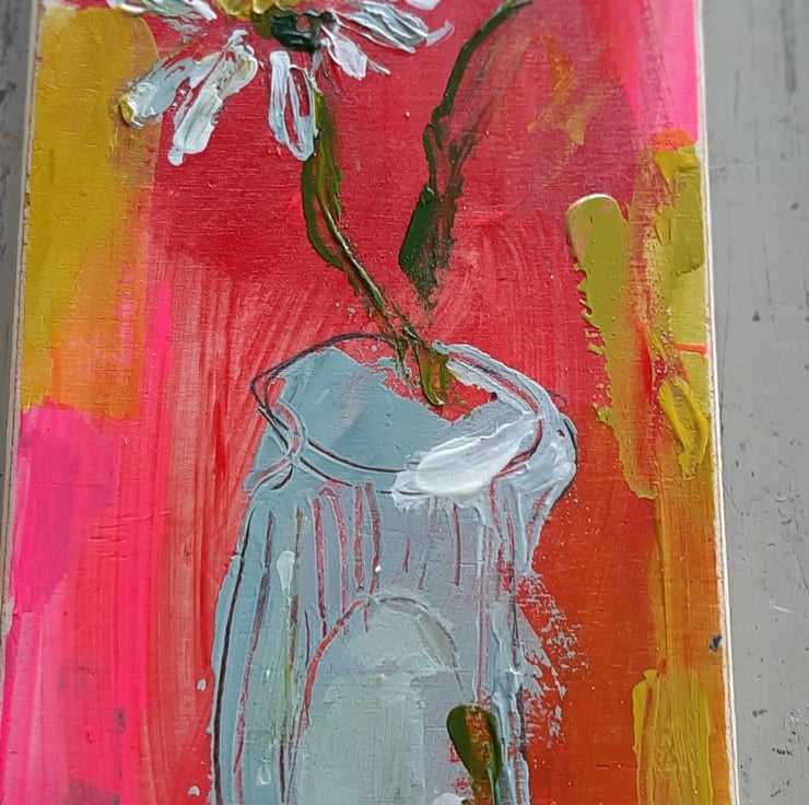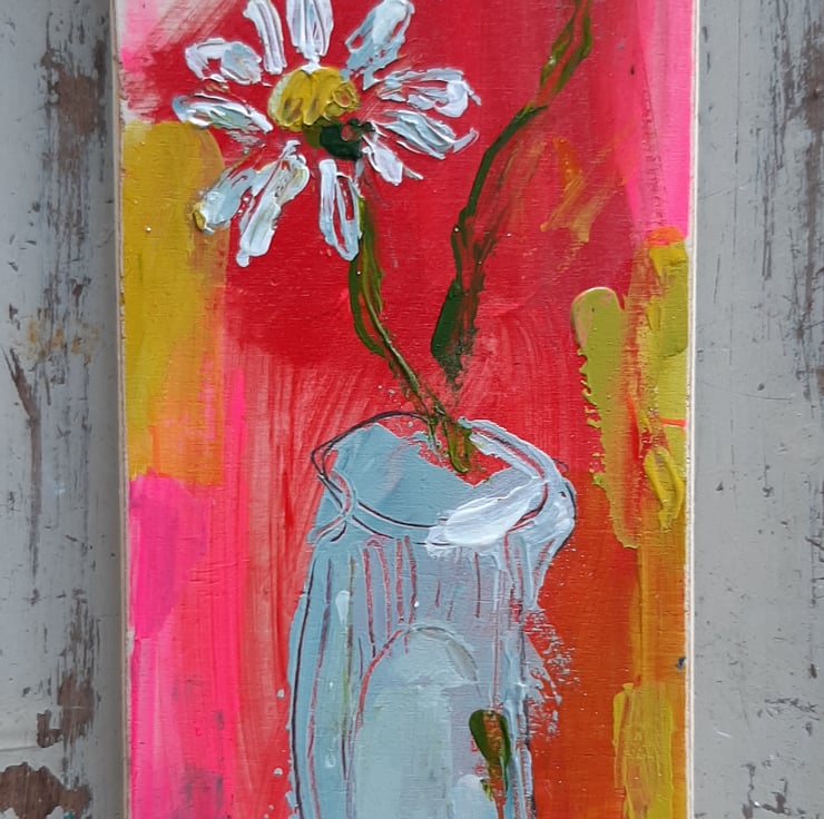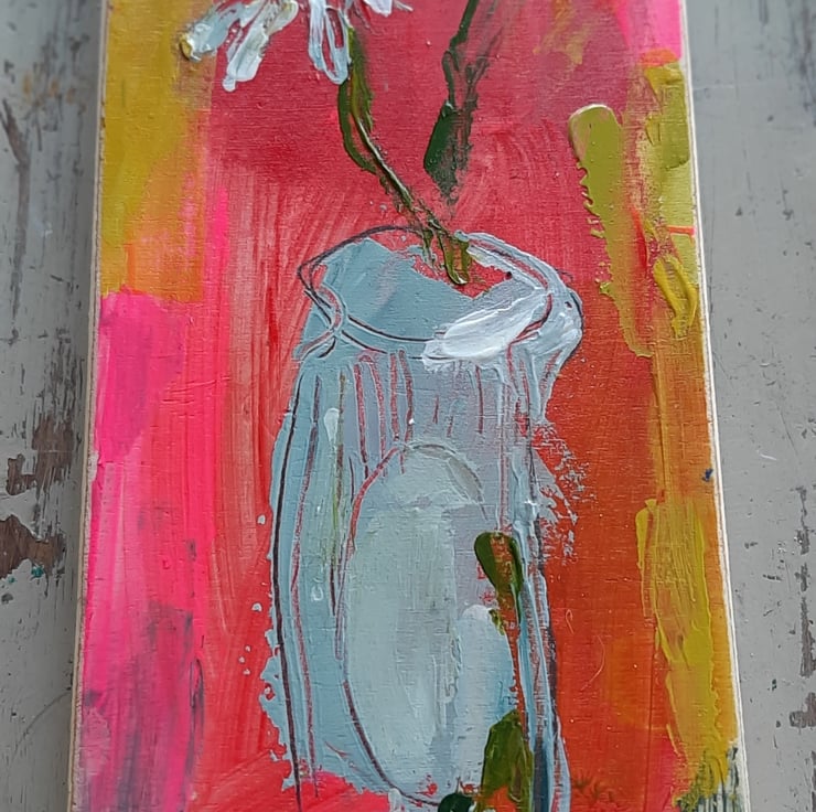 This one really pops of bright hot pinks and reds.full of movement yet in a naive painting style. Loose open confident brush work. By artist Hestasinglewood aka bodkincreates on Instagram. Painted on reclaimed wood measuring 23 cm tall and 9 cm wide. Bright cheerful textured painting.