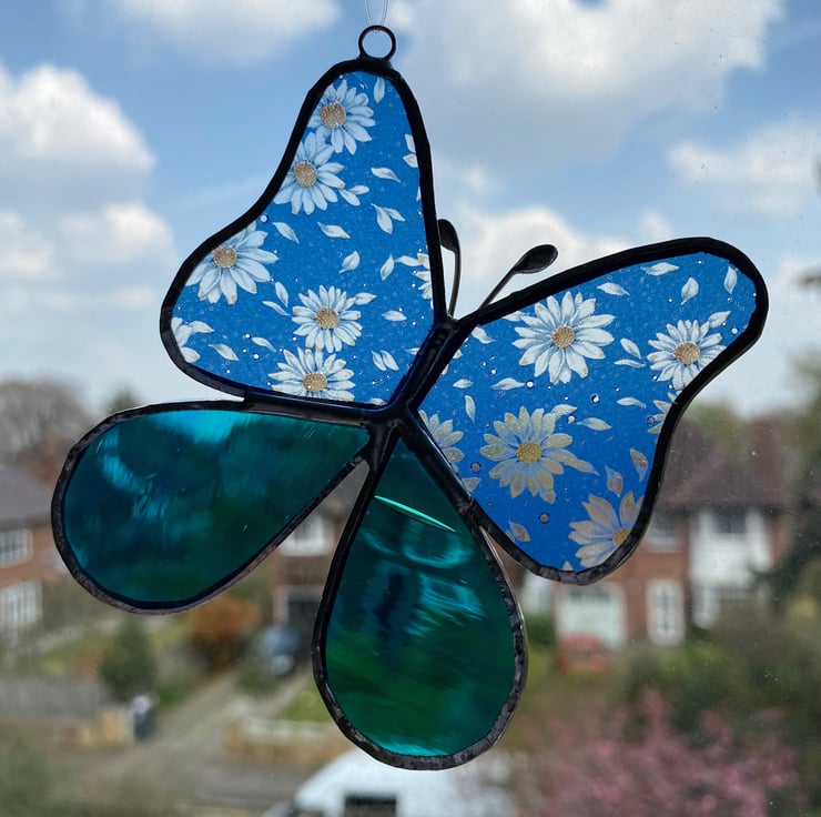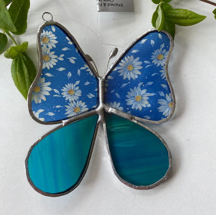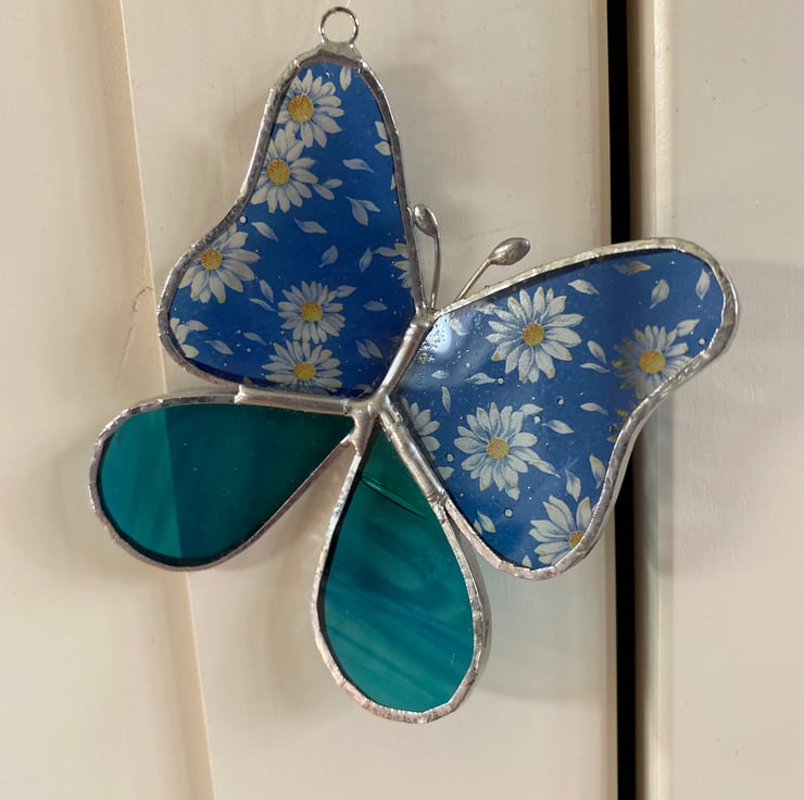 A beautiful stained glass butterfly made using the Tiffany ( copper foiled ) method of stained glass . The 2 main wings are made with a blue glass printed with daisies and the bottom wings are a beautiful aqua. It has a hanging nylon thread . It is completed with wire antenna.