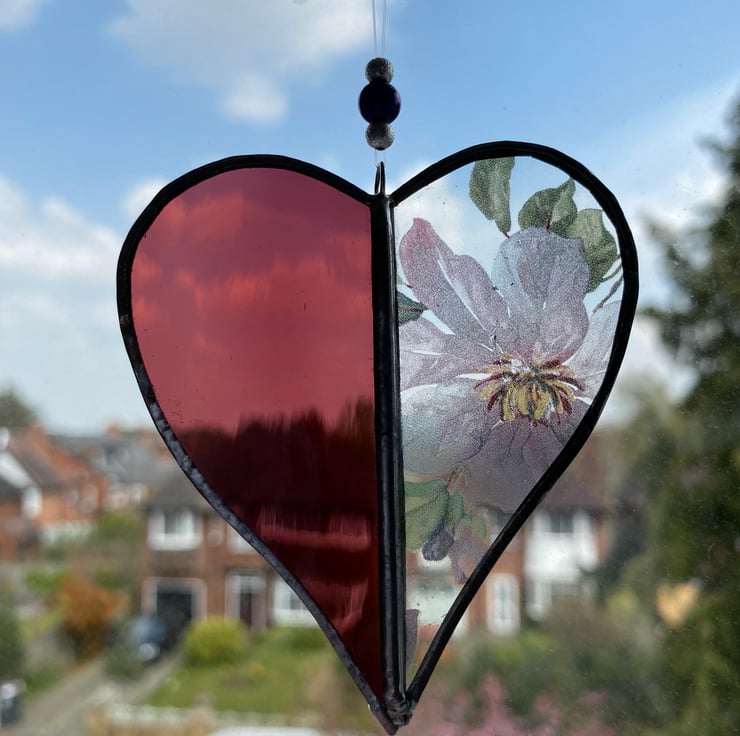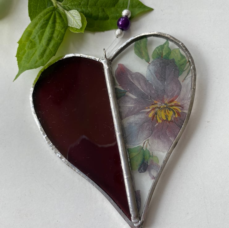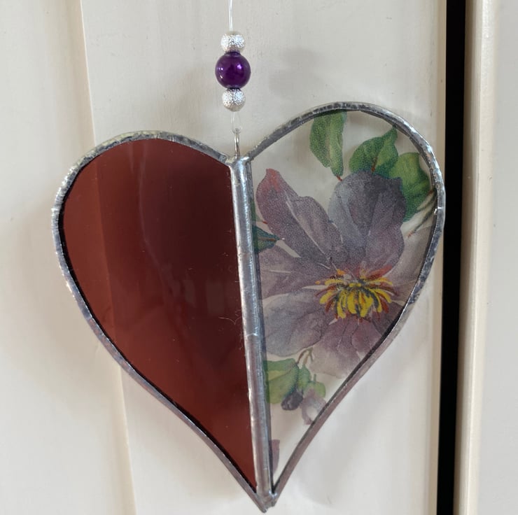 A beautiful 2 tone stained glass heart made using the Tiffany ( copper foiled ) method of stained glass . Each half is a different colour (purple , purple flower pattern )