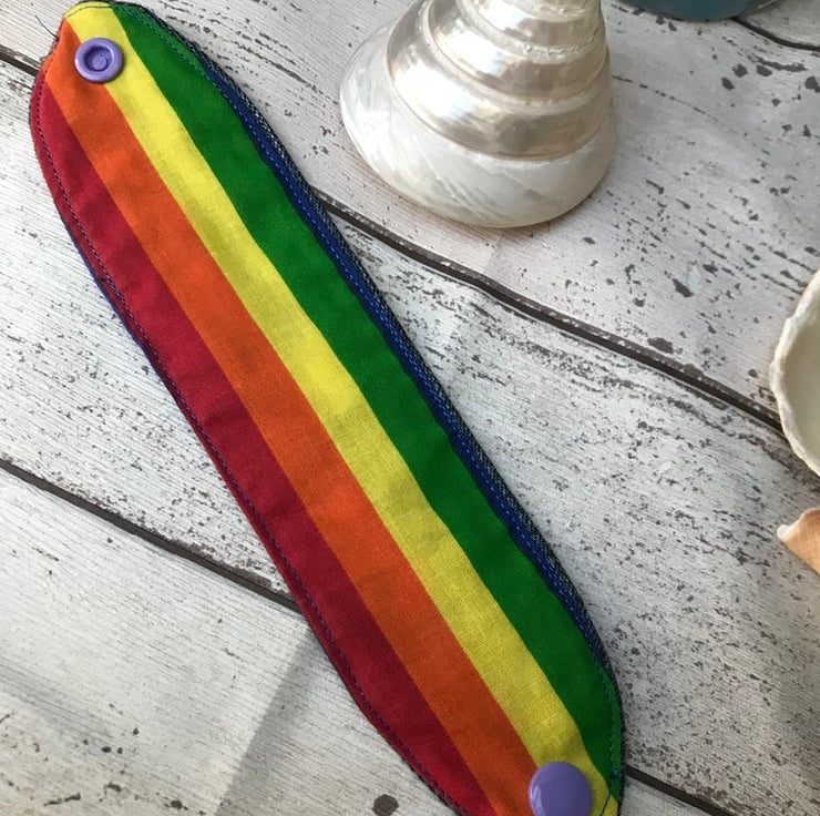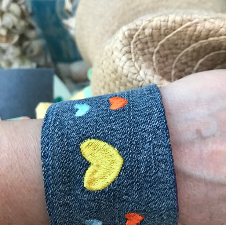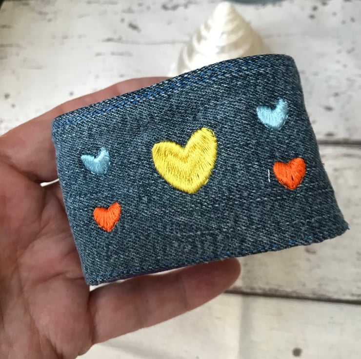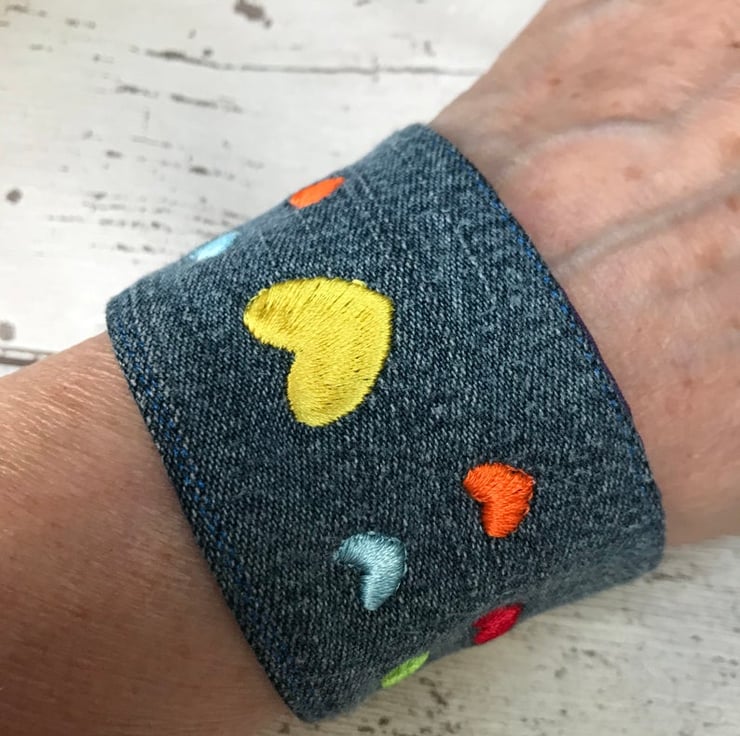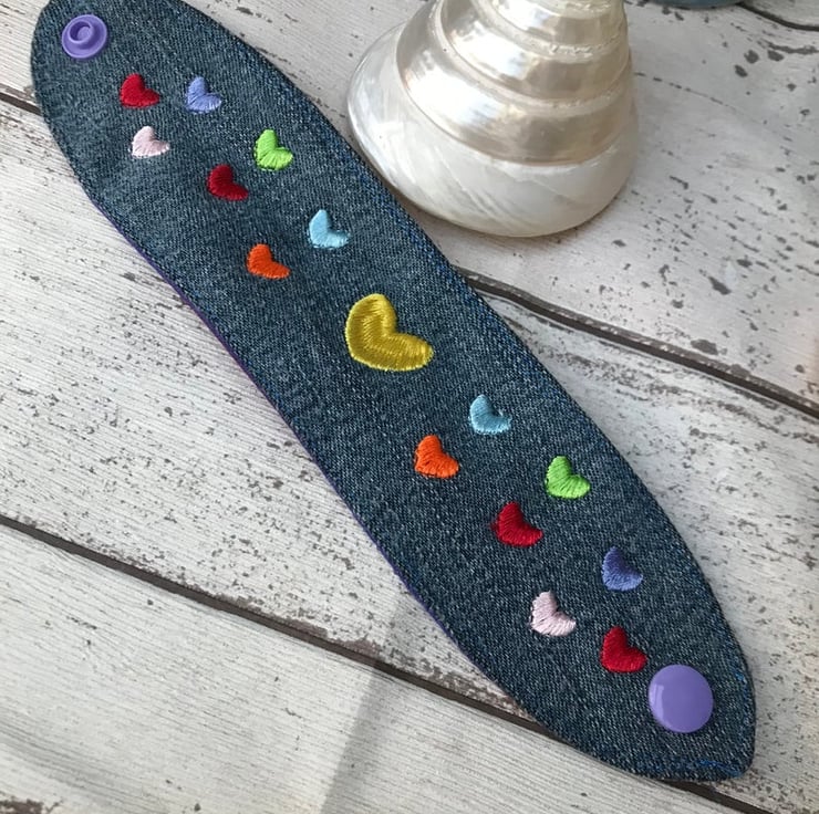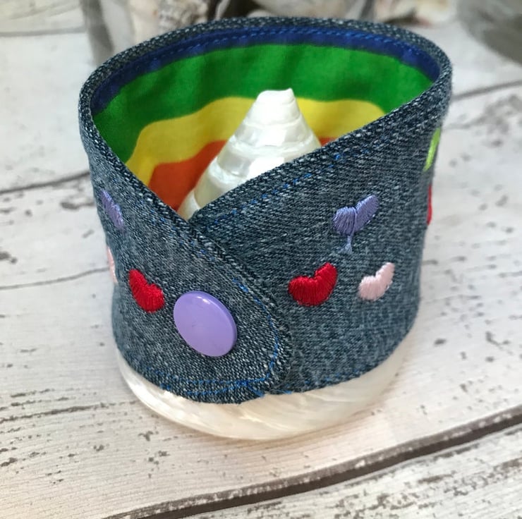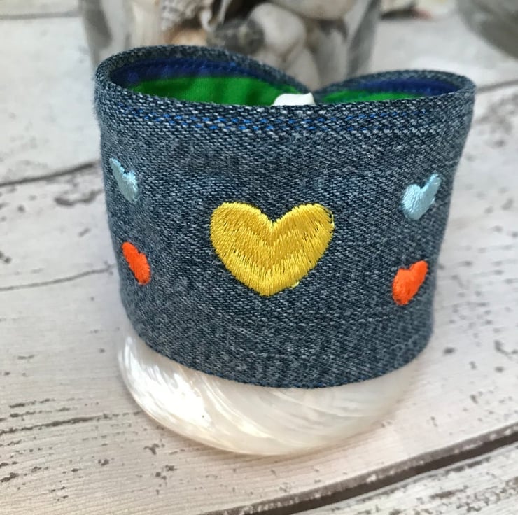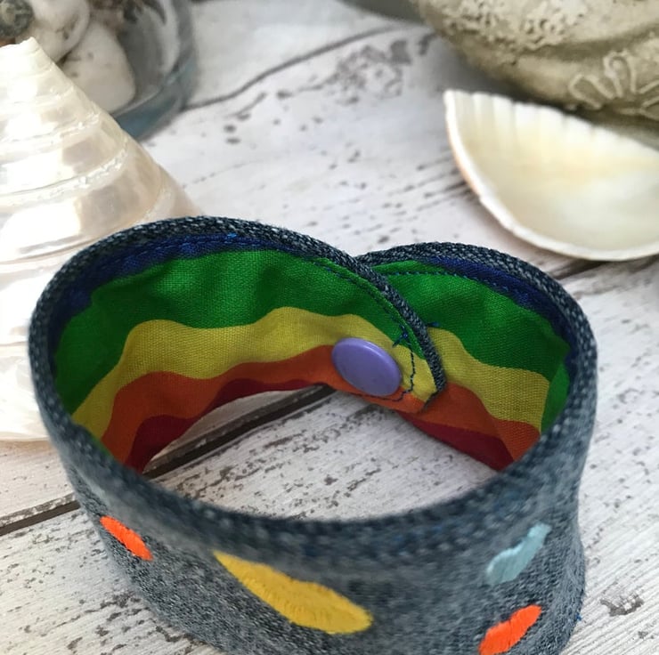 A colourful rainbow of hearts on this easy to wear Cuff using up cycled denim fabric with a rainbow polyester cotton fabric on reverse. Machine Embroidered by me with a gorgeous colourful hearts.