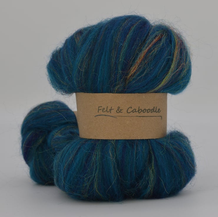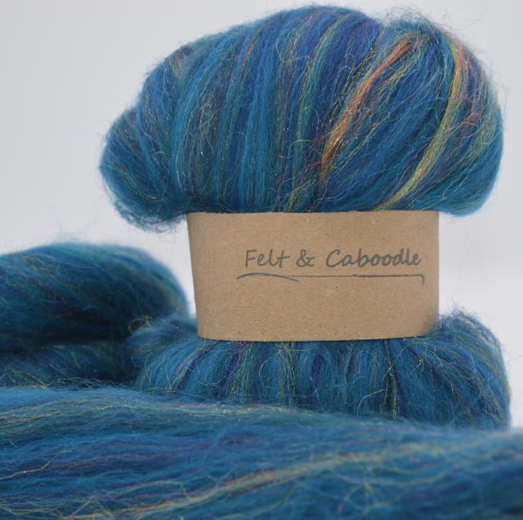 The added sparkle catches the light wonderfully, this fibre is just like a beautiful peacock tail feather and would be perfect for spinning, needle felting, wet felting.