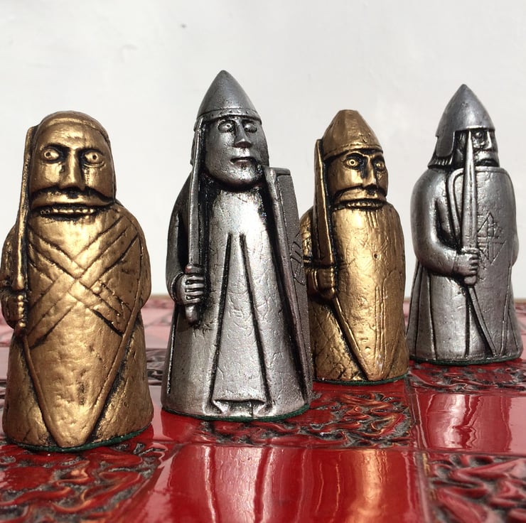 For sale is a true to life replica heritage collection of the 12th Century designed Lewis Chessmen. This special metallic aged effect Lewis chess set is not the same as the Lewis chess sets that are commonly sold. This chess set is larger and is a true to life copy of the original pieces that are housed in both the British & Scottish Museums.