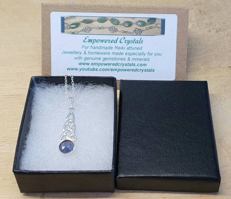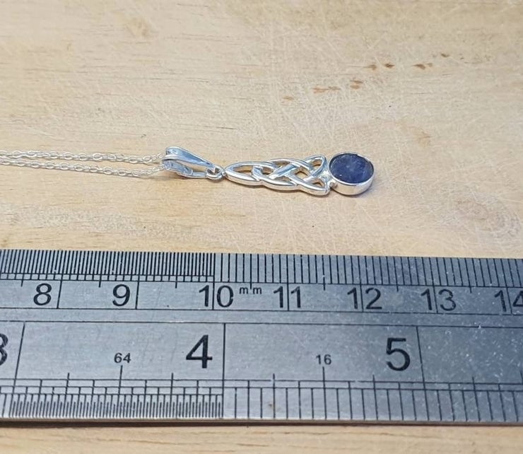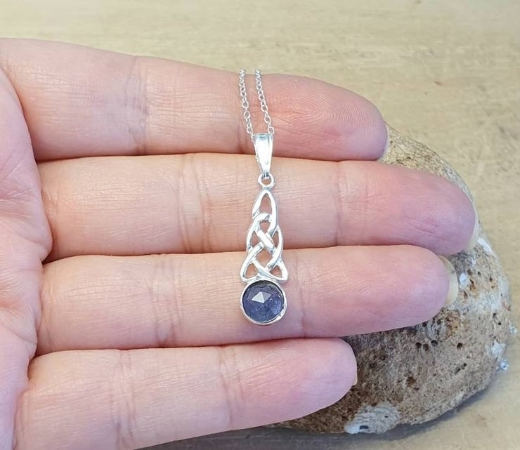 This is a tiny minimalist sterling silver Tanzanite celtic knot pendant necklace.