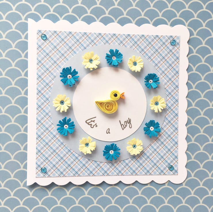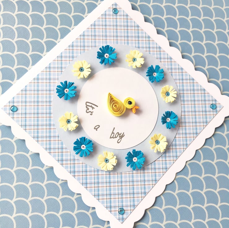 A beautifully-quilled card to celebrate the birth of a new baby boy with the option to add a decorated gift box if desired.