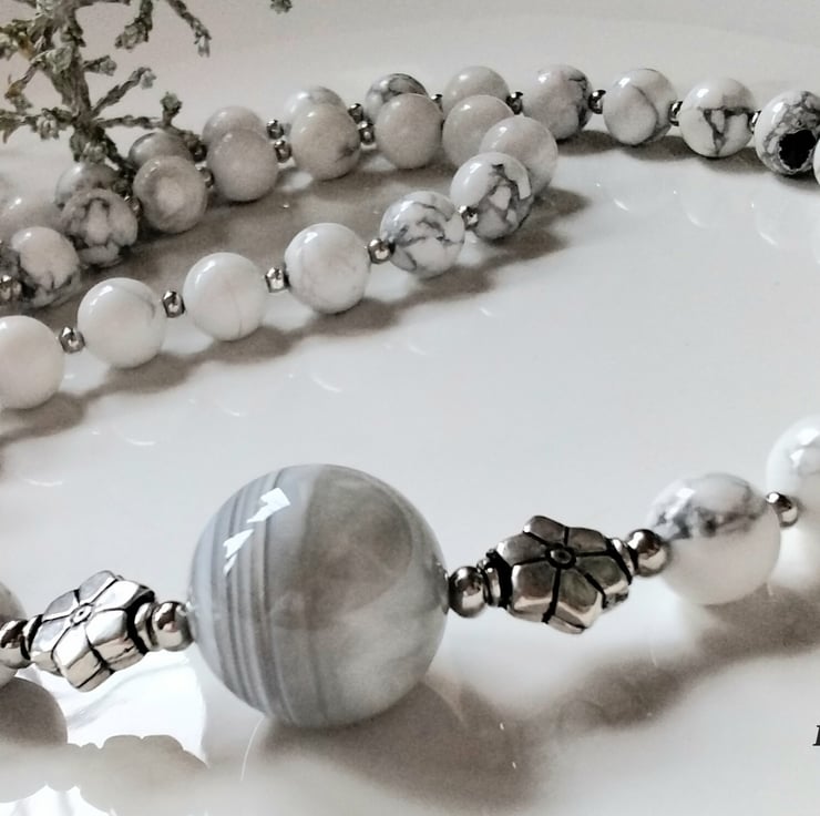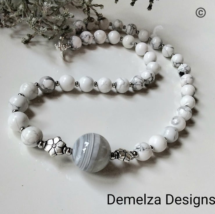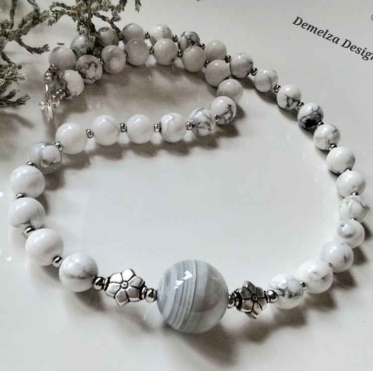 This unique eye catching necklace is a one off only item designed and hand crafted in Cornwall using one centre large 25mm genuine gray lace agate round gemstone bead complimented with 8mm howlite round gemstone beads. Between the centre agate are decorative tibetan silver style beads. All other spacer beads used are quality 2.5 mm rondelle silver plated, adding a touch of sparkle around the neckline during wear.