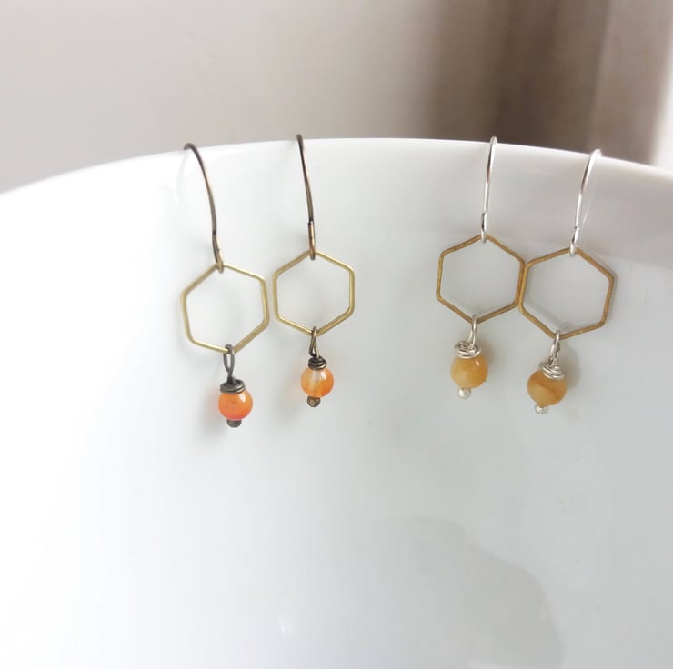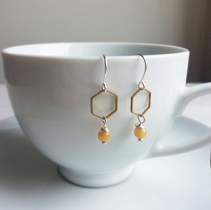 These delicate golden brass hexagons hang on silver plated wires, with a little yellow jade bead.