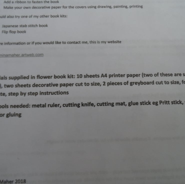 The pack includes 10 sheets of A4 paper for the pages, two sheets of decorative paper for the covers, 2 pieces of 2mm stiff greyboard for the covers, a folding template, step by step instructions.