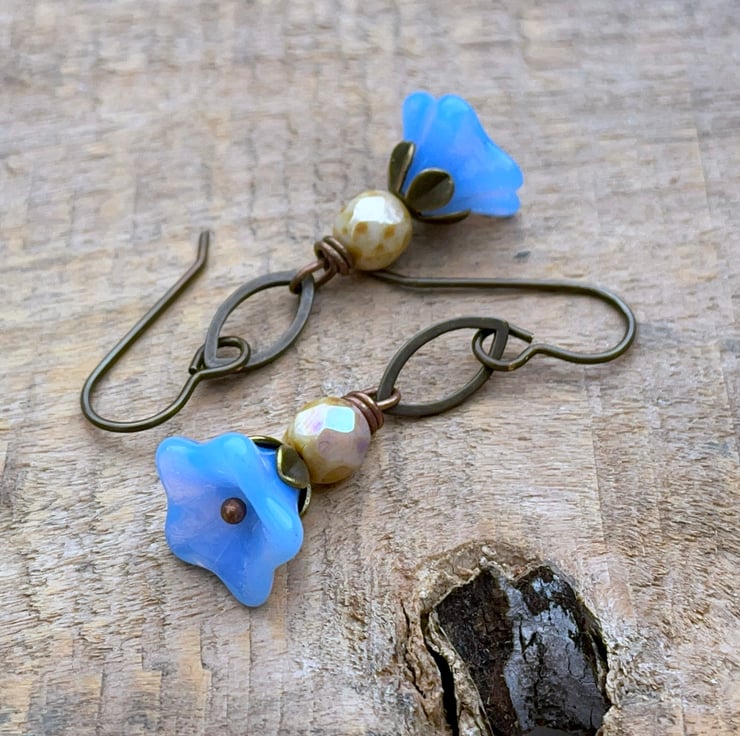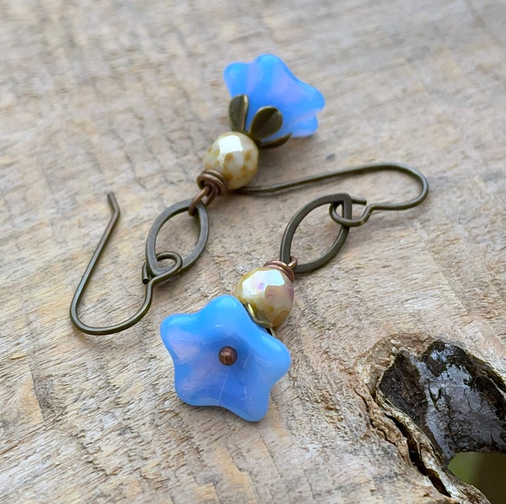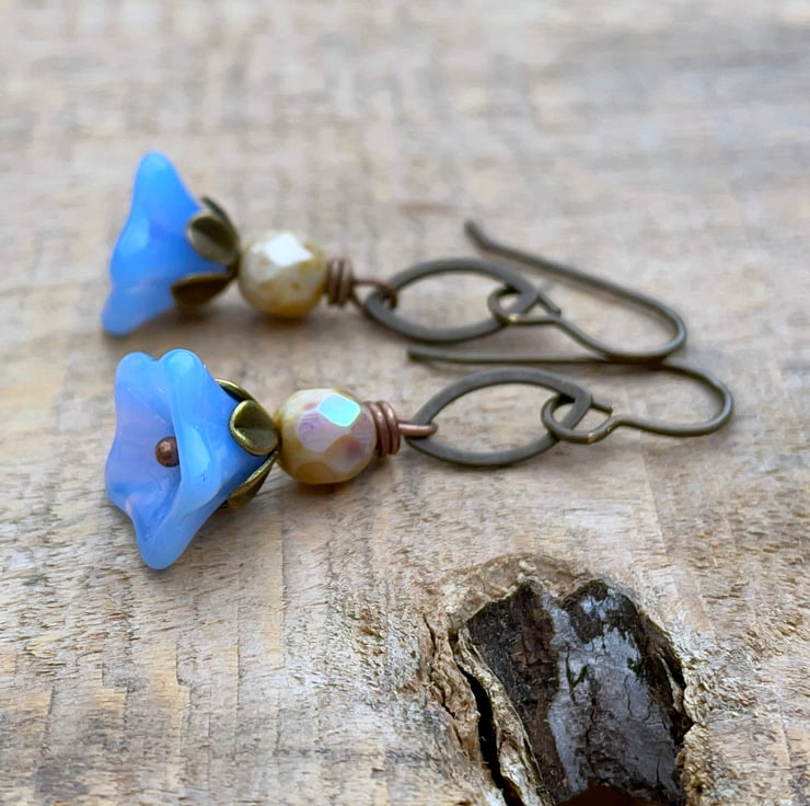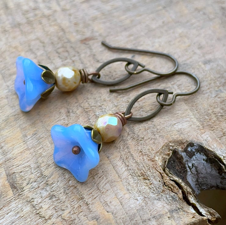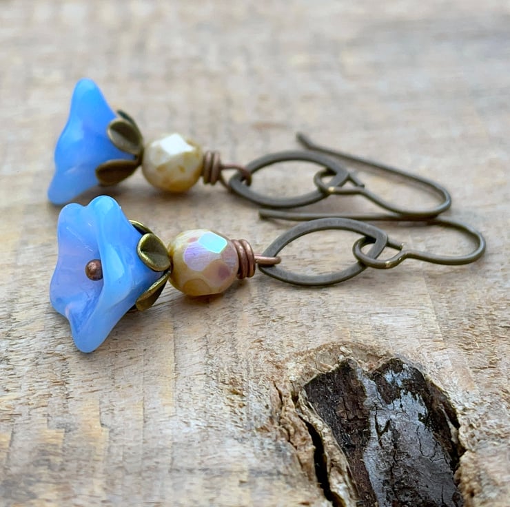 These petite earrings feature Czech glass trumpet flowers in soft shade of cornflower blue.