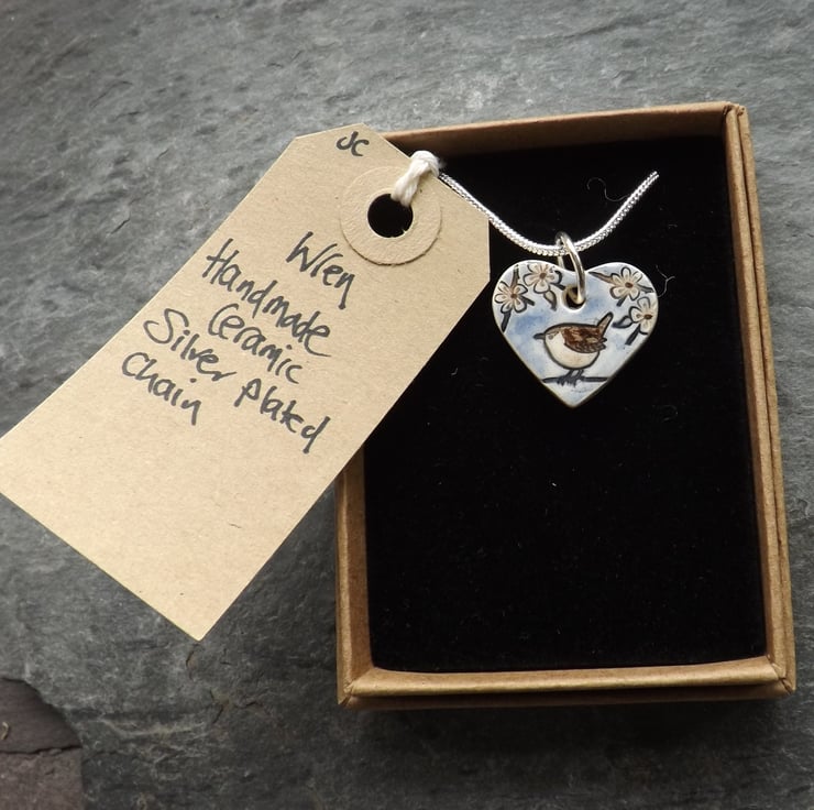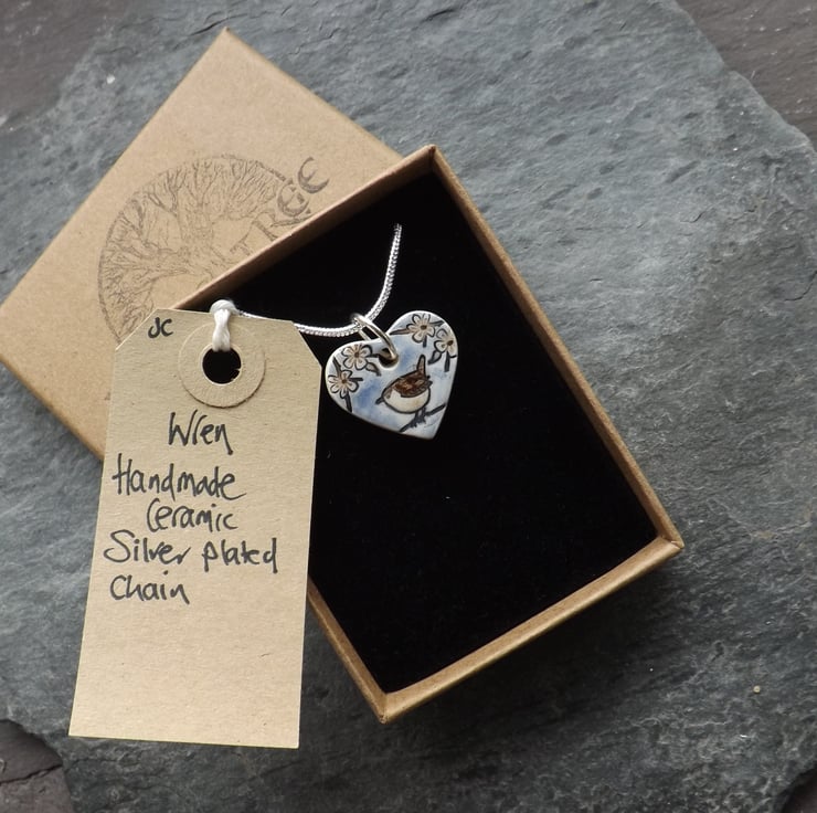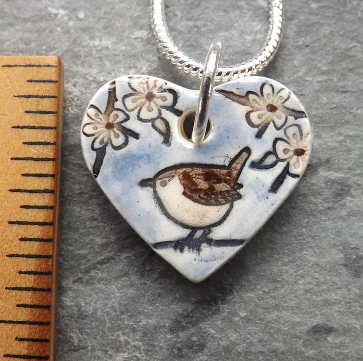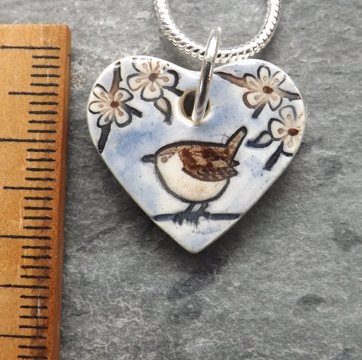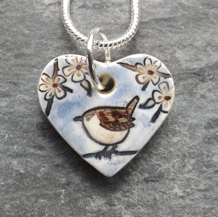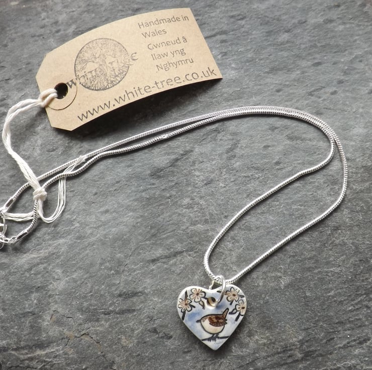 This pretty little heart shaped pendant has a wren amongst blackthorn blossom and a wash of soft blue over the background.