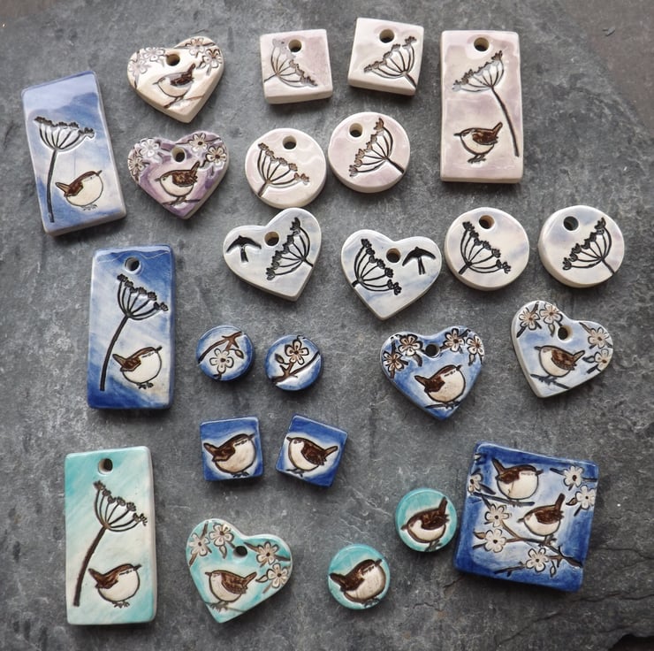 After forming my pendants from fine white clay, I imprint my design. When dry, I sand the back and sides of the pendants and round off the corners to ensure they are super smooth. They then have their first firing. Next I paint them using under-glazes and apply a transparent glaze before firing again to earthenware. Being glazed all over they are smooth against the skin whilst retaining the texture of the imprinted design. The result is a pleasantly tactile item.