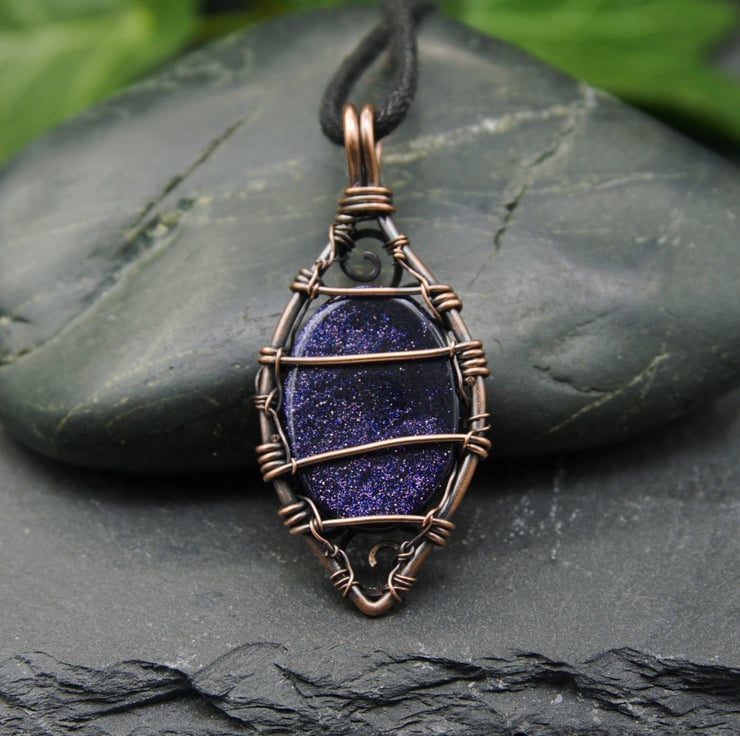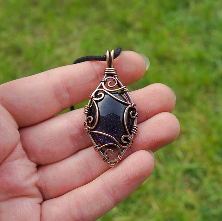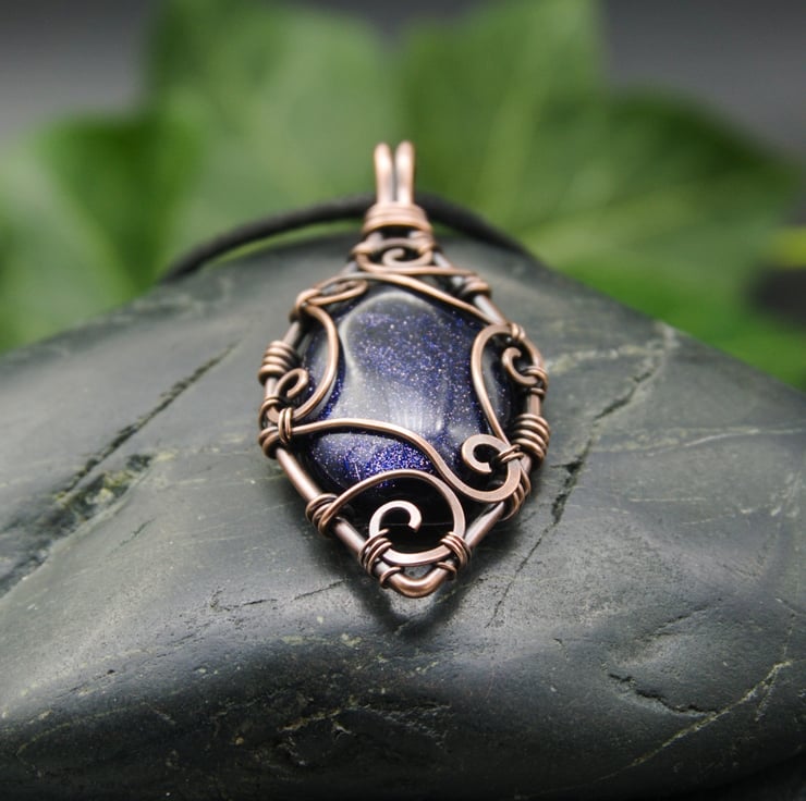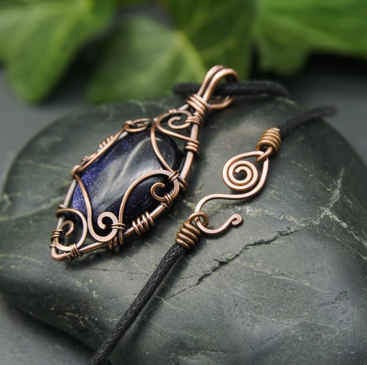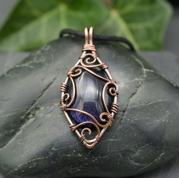 This beautiful pendant has been completely handmade from copper wire and features a Blue Goldstone cabochon. The stone sits within a frame of thick copper wire, shaped into a pointed oval. I have created matching scroll details around the sides of the pendant to capture the stone - these spirals and swirls have been hammered flat and then carefully laced together with fine wire.