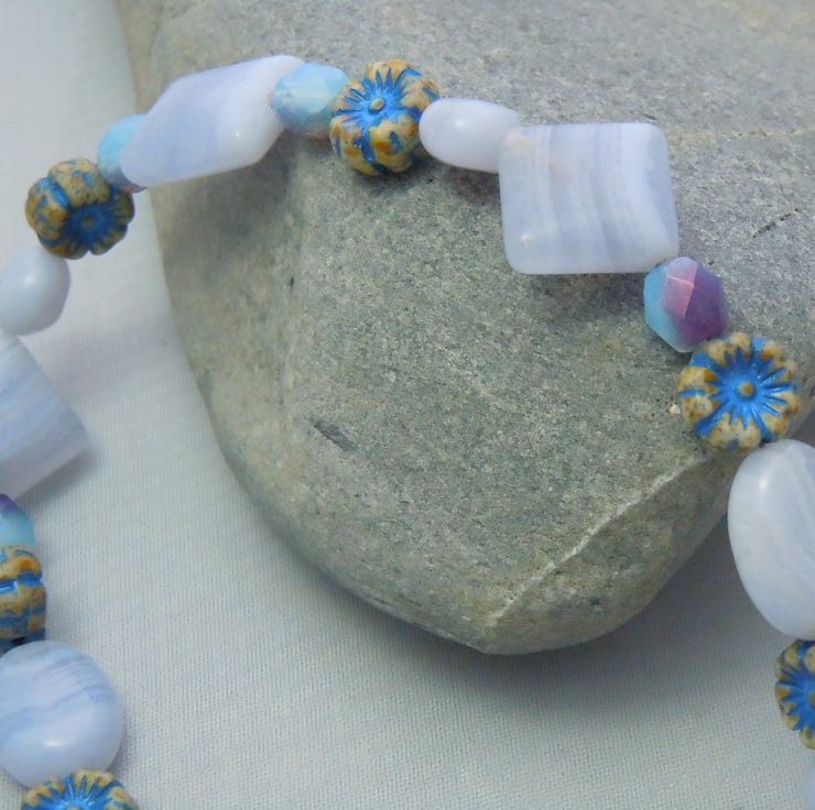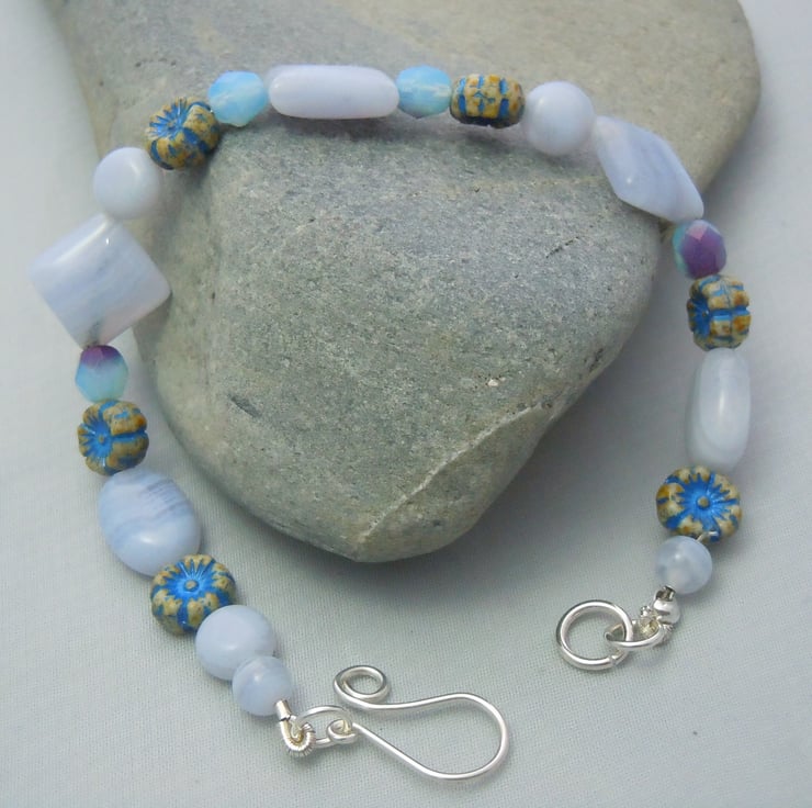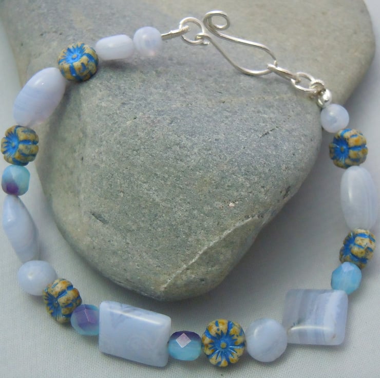 A Sterling Silver bracelet with increasingly rare Blue Lace Agate semi precious beads in assorted shapes with Czech glass blue Hibiscus flower beads & faceted two tone blue beads finished with a handcrafted Sterling Silver clasp. Beautiful relaxing blues of the sea & sky. Agate is a birthstone for May.