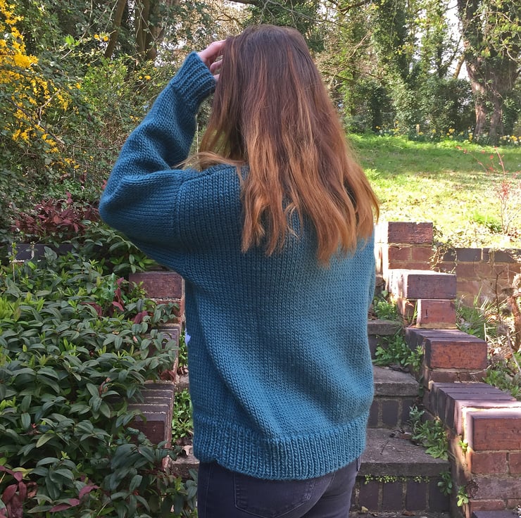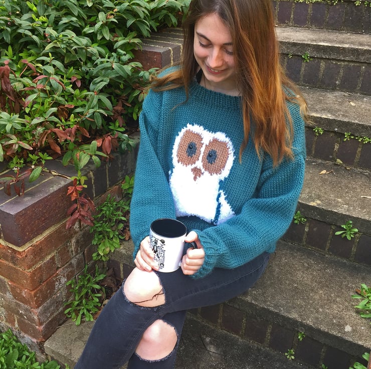 This warm, chunky sweater is designed to be oversized, making it ideal for relaxing in. It features Oliver Owl.