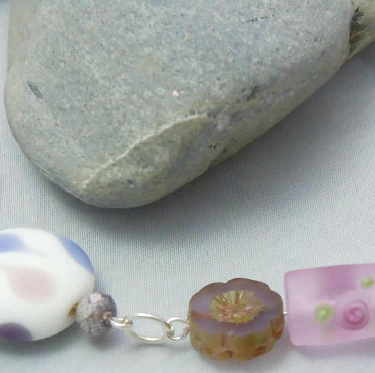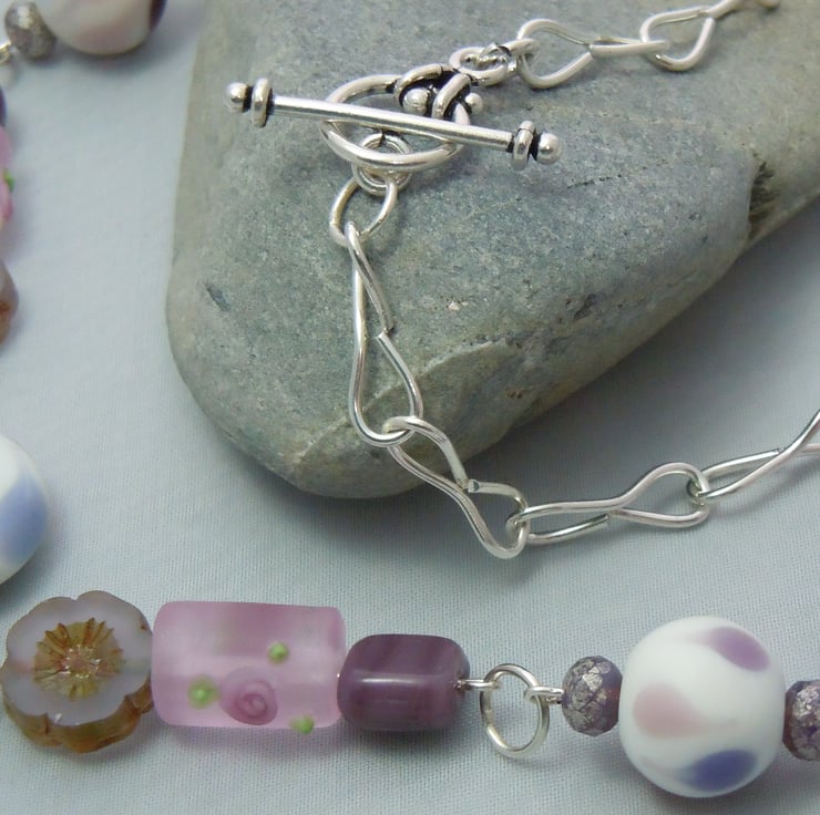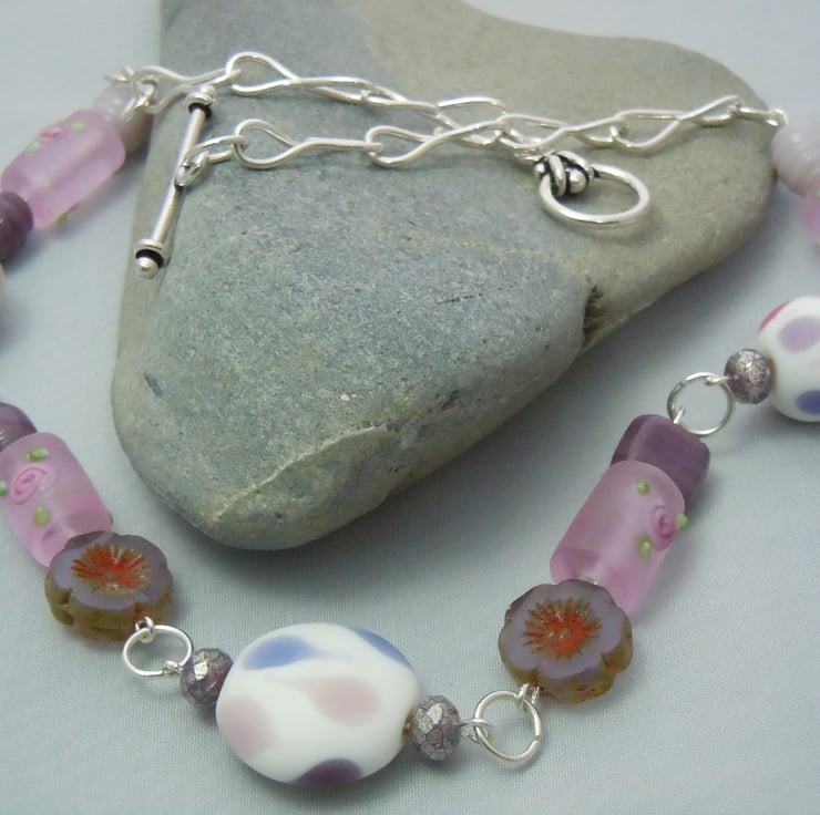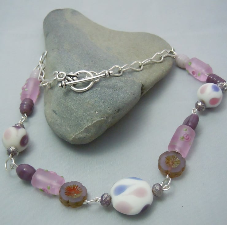 A statement necklace with a beautiful focal Artisan white/pink/purple glass coin bead & two matching round beads, also various glass beads including pink tube beads with a raised flower design, purple & lavender beads & Czech glass Picasso pansy flower beads, Czech glass faceted rondelle fire polished purple beads. These beads are connected with silver plate wire & jump rings & a silver plate large link chain & toggle clasp. There are similar earrings. A lovely collection of beautiful beads in summery pink & purple colours.