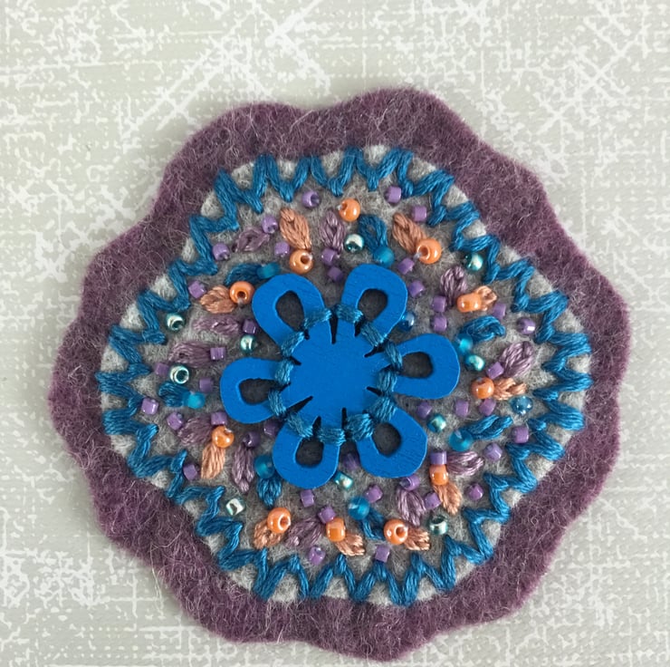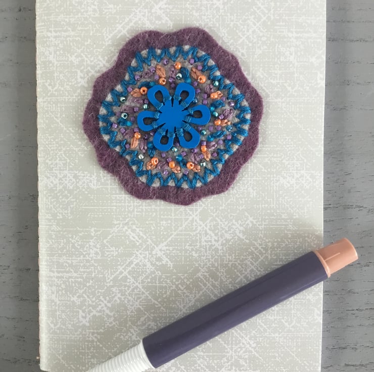 This Hand Embroidered Flower Notebook with Pen has a hand embroidered front cover. A blue wooden flower motif is stitched onto circles of grey and heather felt. Lazy-Daisy and Fly Stitches, dotted with seed beads, are hand embroidered around this flower in blue, heather, grey and amber colours. This embroidery is on the mottled grey front cover. A pen matches this notebook……making a nice gift set.