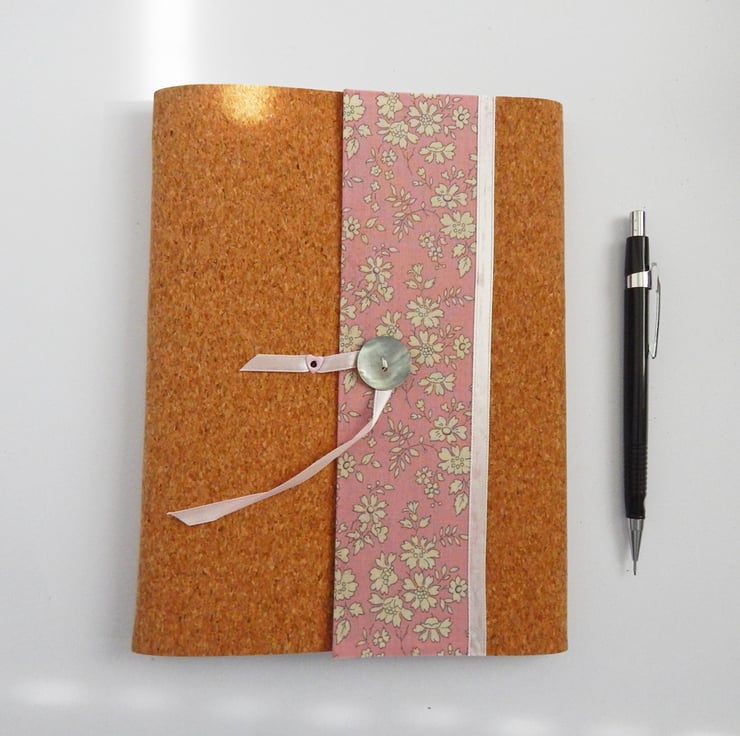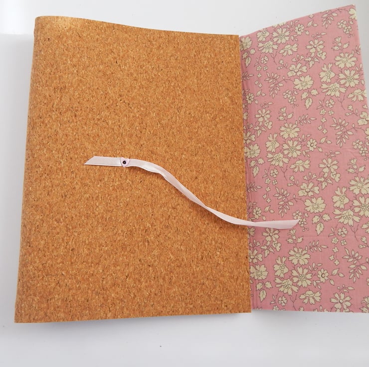 A5 size Notebook Cover in cork fabric, lined with Liberty Tana Lawn cotton, in "Capel" design - a delicate design of leaves and flowers, in ivory on a pastel pink background.