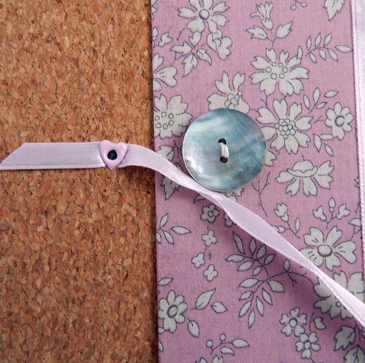 - A wrap-over flap closes the cover & protects the notebooks inside. It has a strip of matching fabric and a pale pink satin ribbon trim.